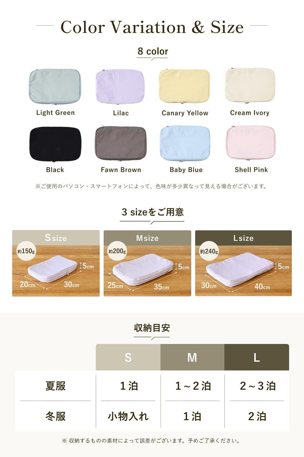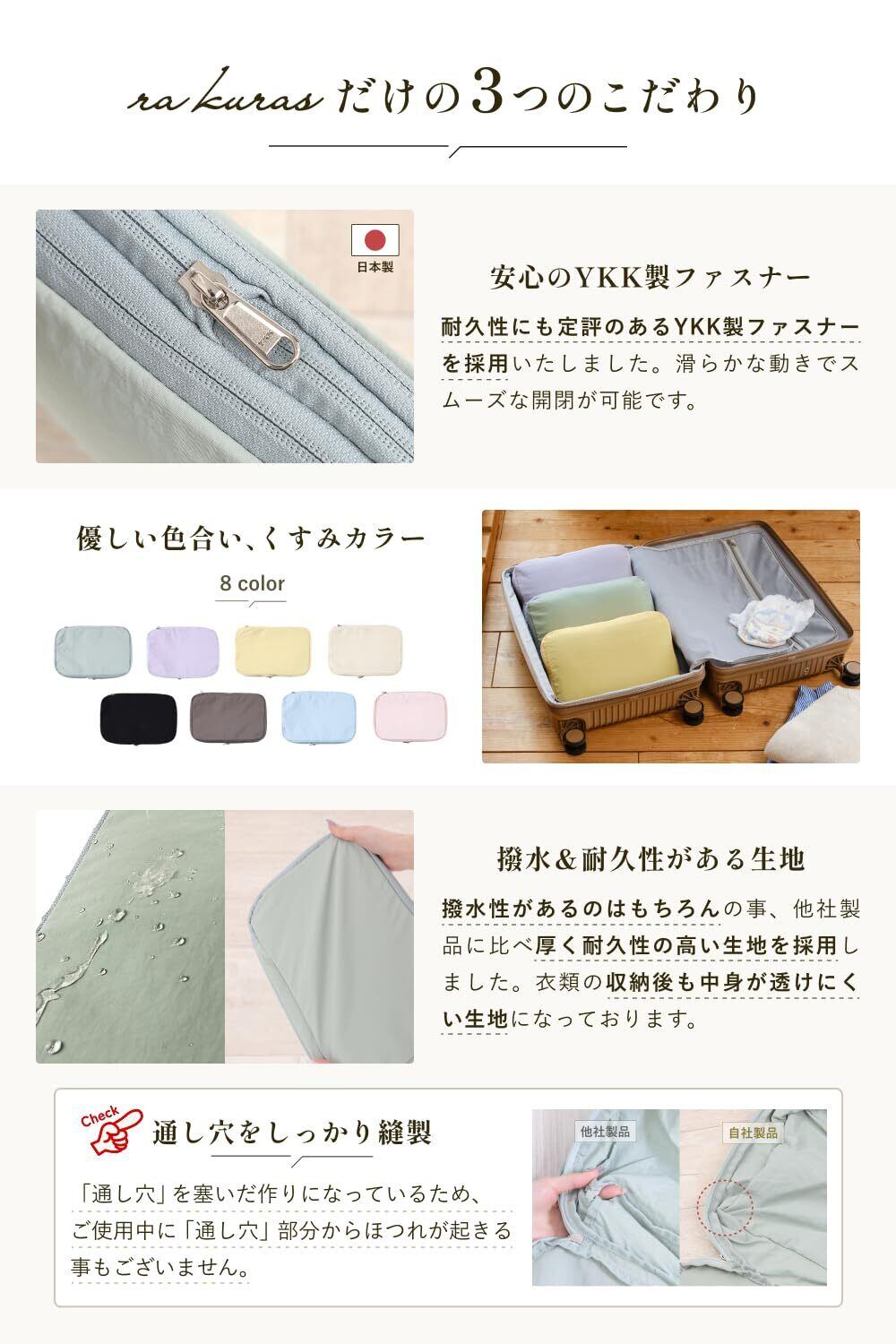 【撥水&耐久性のある生地】 撥水性があり、他社製品に比べて厚く耐久性の高い生地を採用しました。衣類の収納後も中身が透けにくくなっております。