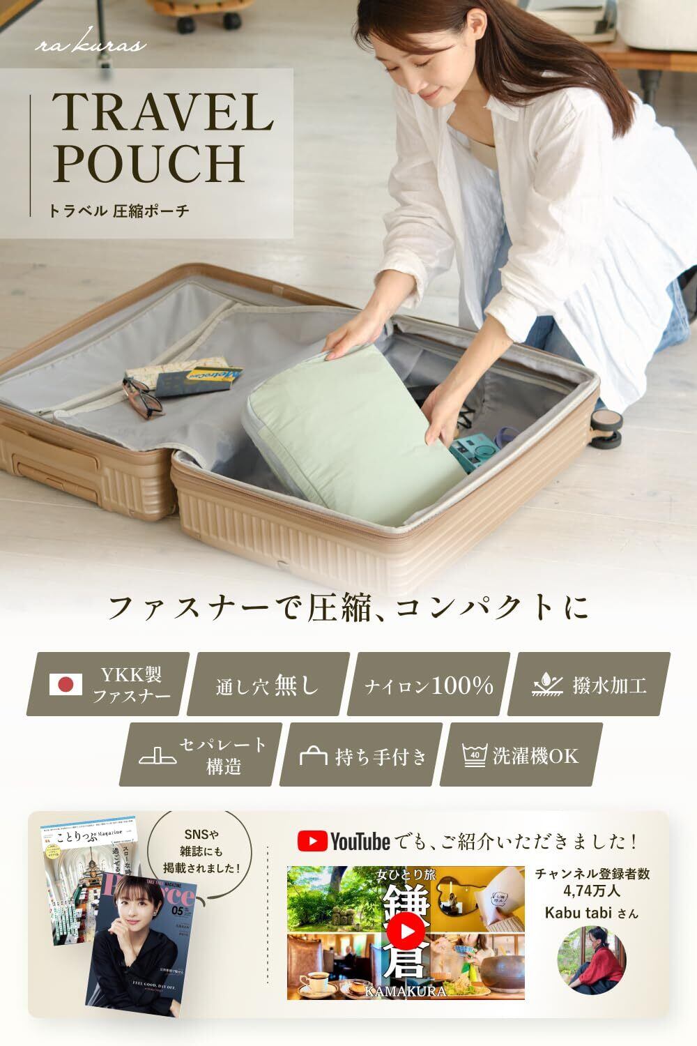 【ナイロン製のポーチだから、長く使える】 ビニール製の圧縮袋とは違い、長くご使用できます。使い捨てではないので、環境にもやさしいポーチです。