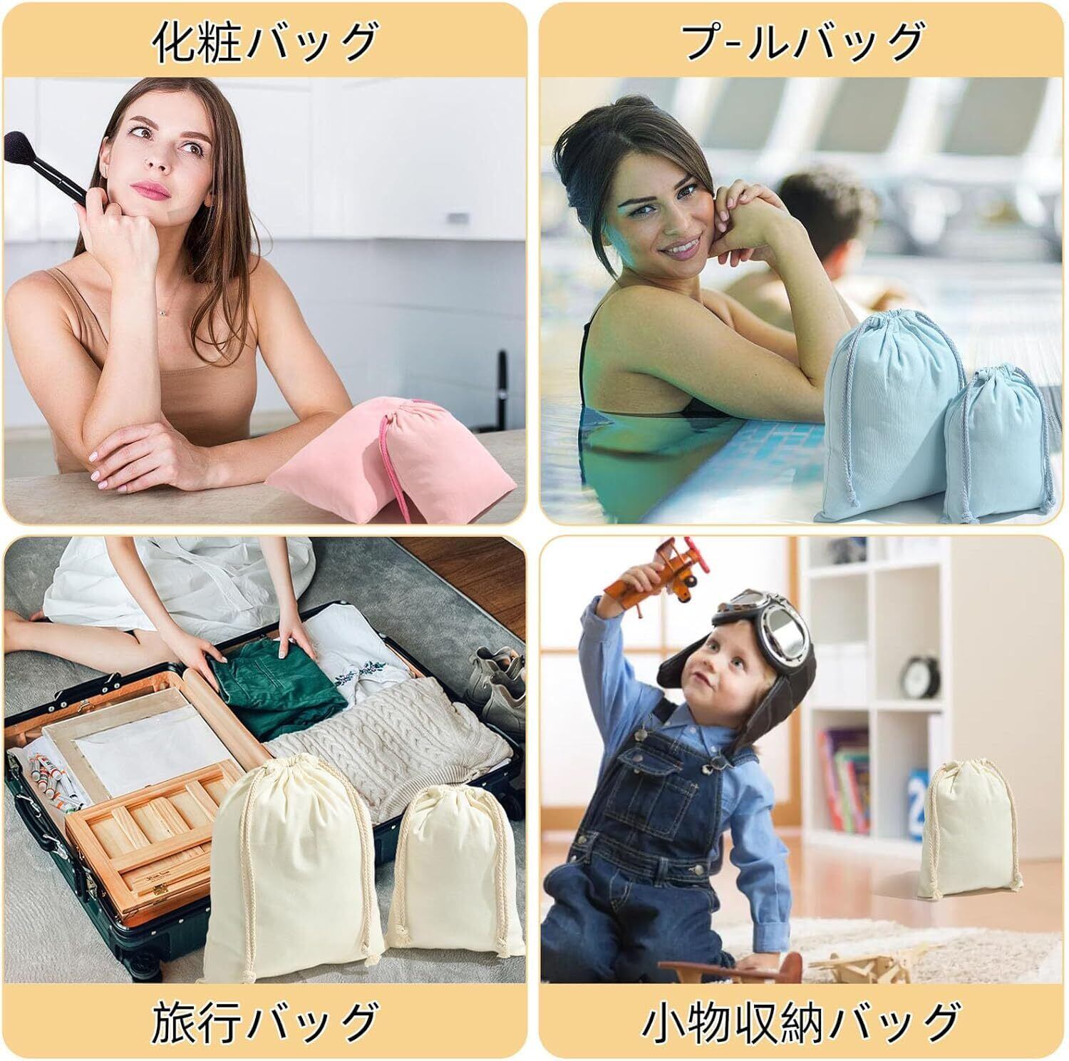 "自然に優しいオーガニックコットン使用" 当社の束口バッグは、無漂白のオーガニックコットンで作られており、肌に優しく環境にも配慮しています,コットンは通気性に富んでおり、蒸れにくくさらさらとした感触を保ちます。また、化学繊維に比べると静電気が起こりにくいため、乾燥しがちな季節でも持ちやすいです。繰り返し使えるエコバッグとして、プラスチック削減に貢献できます,全綿材料は固色技術を採用し、商品の洗浄を受けた後に使用する