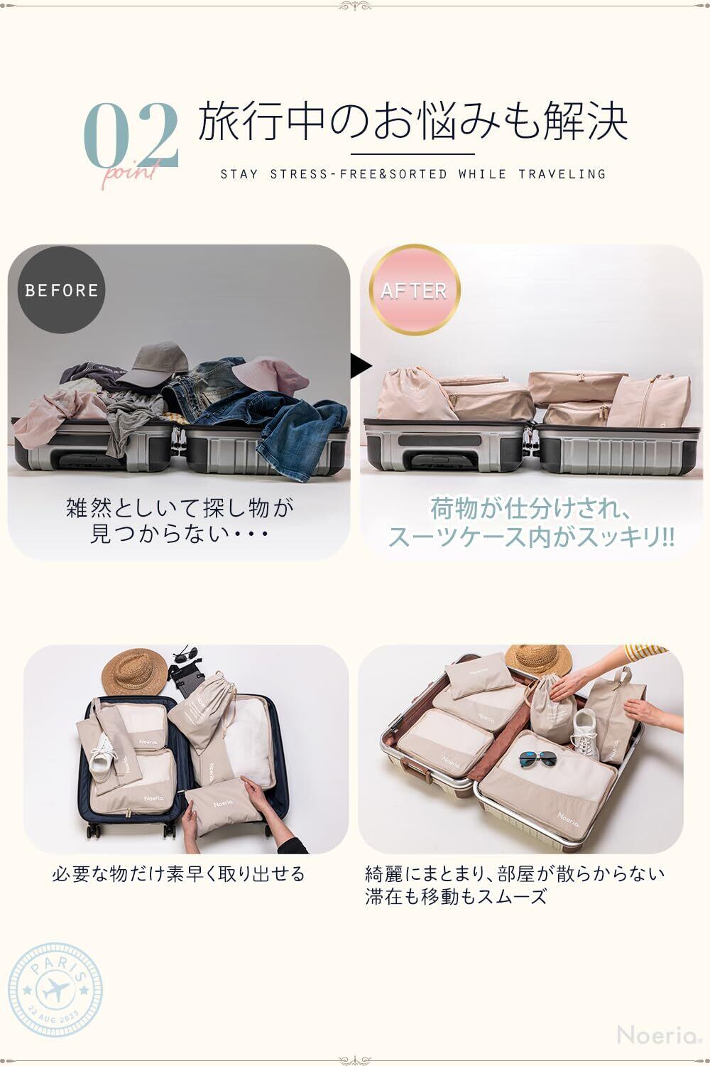 【充実の6点セット】コットンのような優しい手触りが特徴のNoeriaポーチ。サイズ・形状が異なるアレンジケース6点セット。衣類、シューズ、小物等目的にあわせ簡単に仕分け収納。軽量で柔らかい素材のためスーツケース内でかさばりません。フロントメッシュで中身が一目瞭然、通気性も◎。スーツケース内が整理されるだけでなく、統一されたデザインとカラーにより見た目もスッキリ!旅行準備の悩みは解消され、旅行が快適になります。サイズ:衣類収納ポーチL42*32*12cm、M34*28*12cm、S32*23*12cm、巾着袋35*26cm、シューズケース37*21*12cm、小物入れポーチ27*20cm。