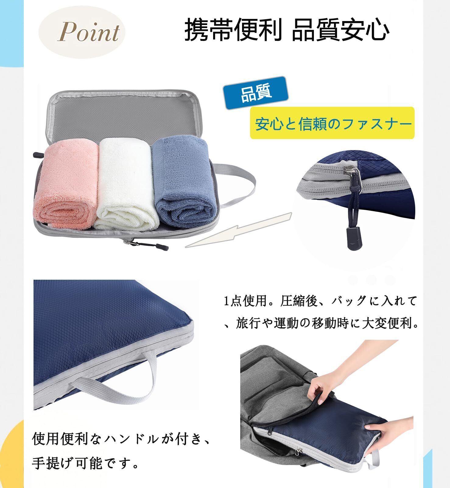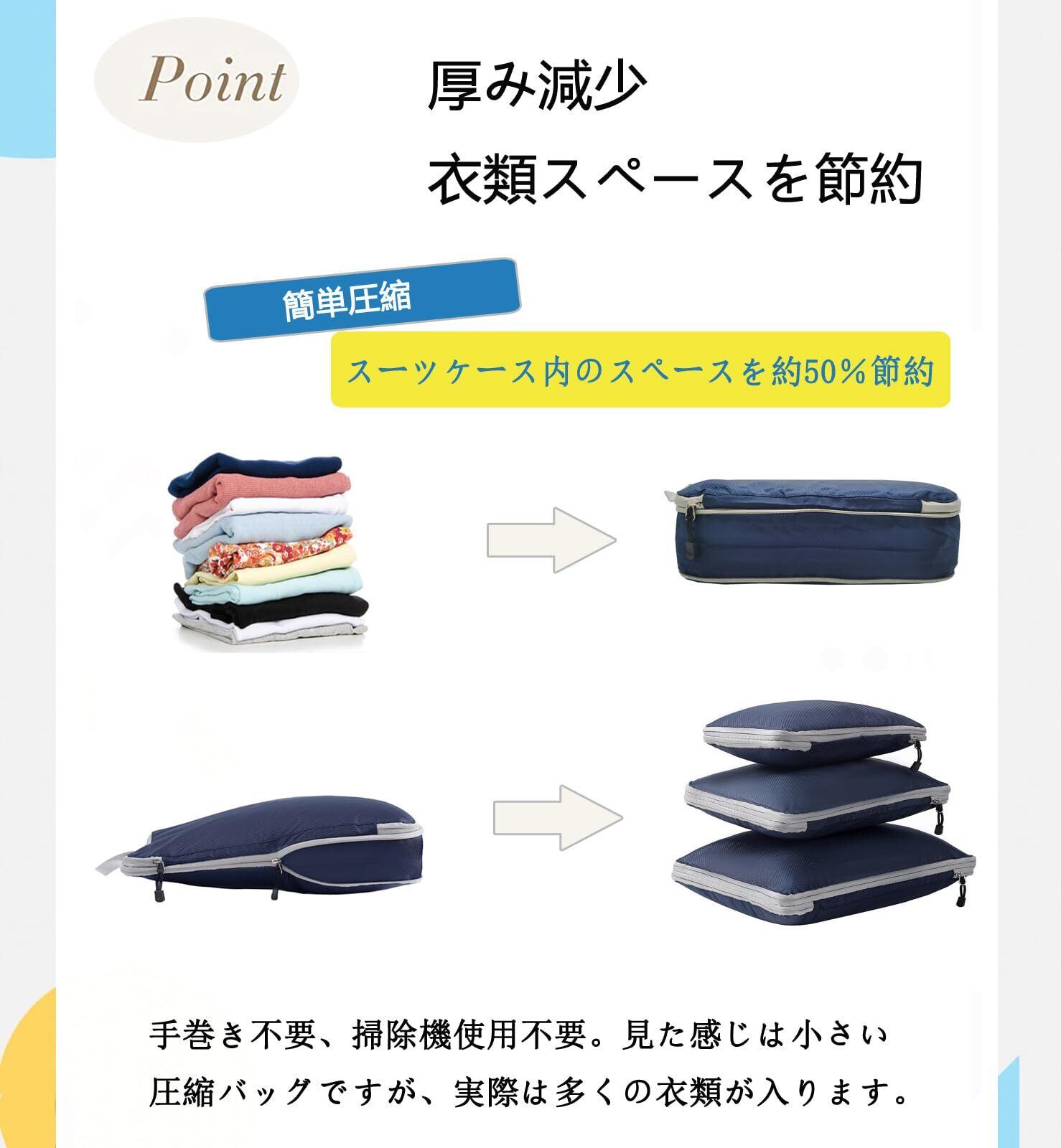 【簡単圧縮・スペース節約】ジッパーを使用して簡単圧縮。この 製品は ファスナーにを閉めるだけでOKの圧縮機能ですので 圧縮用の吸引機の圧縮効果はありません。圧縮バッグに衣類を入れた後、圧縮ジッパーを閉めてスーツケース内のスペースを約50%省くことができます。高品質ジッパーを使用して、ファスナー壊れにくく。ご安心使用してください。見た感じは小さい圧縮バッグですが、実際は多くの衣類が入ります。