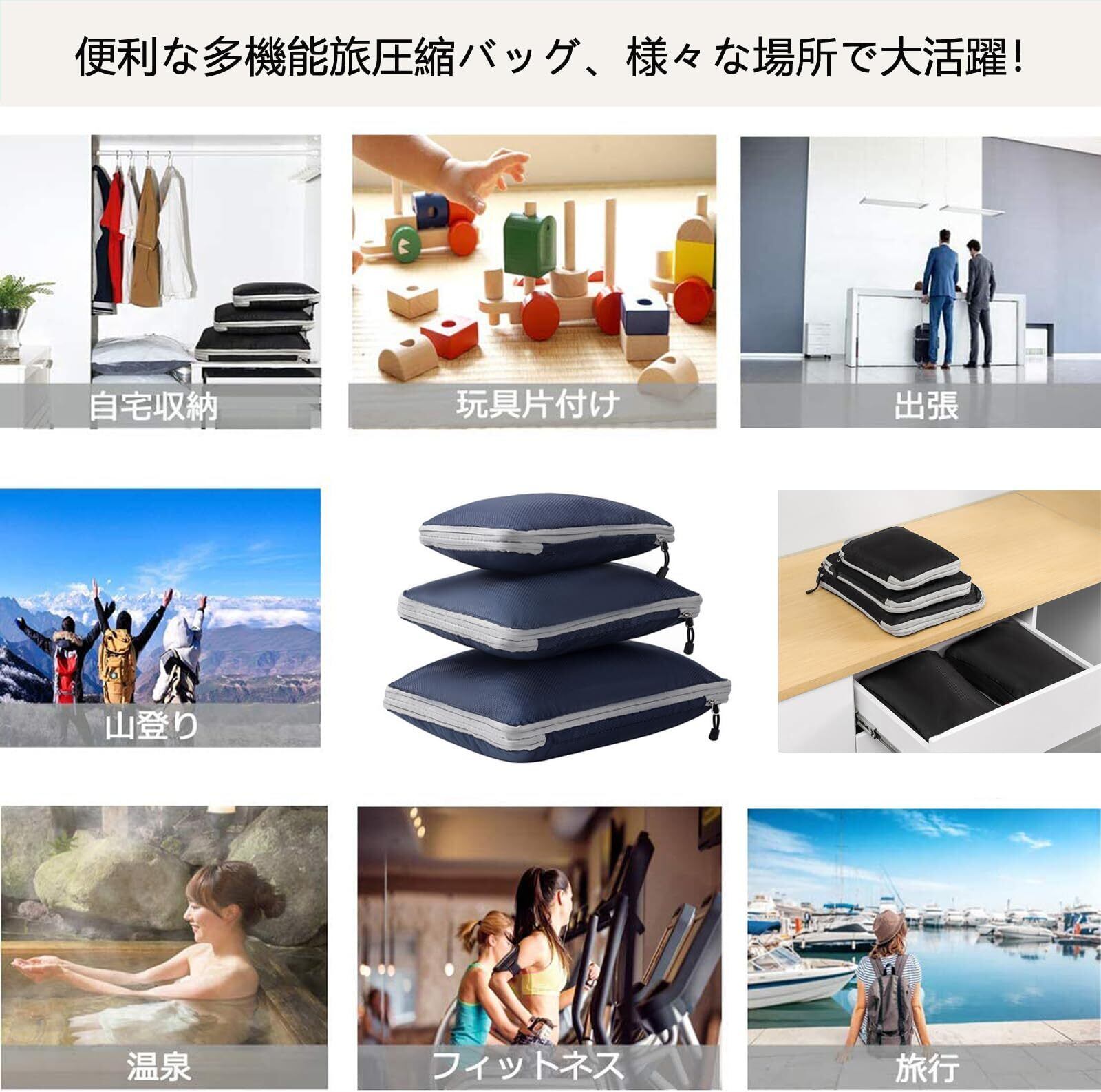 【旅行出張に便利】便利旅行圧縮バッグ3点セット 出張、旅行だけではなく、温泉やスポーツやキャンプなどのアウトドアにもご利用いただけます。災害時の持ち出し用や入院用としても使えます。外出用のほか、普段でも家族の衣服や小物等も収納して整理できます。通気性が良く、水洗い可能、生地はしっかりしていて、お洒落な収納バッグです。