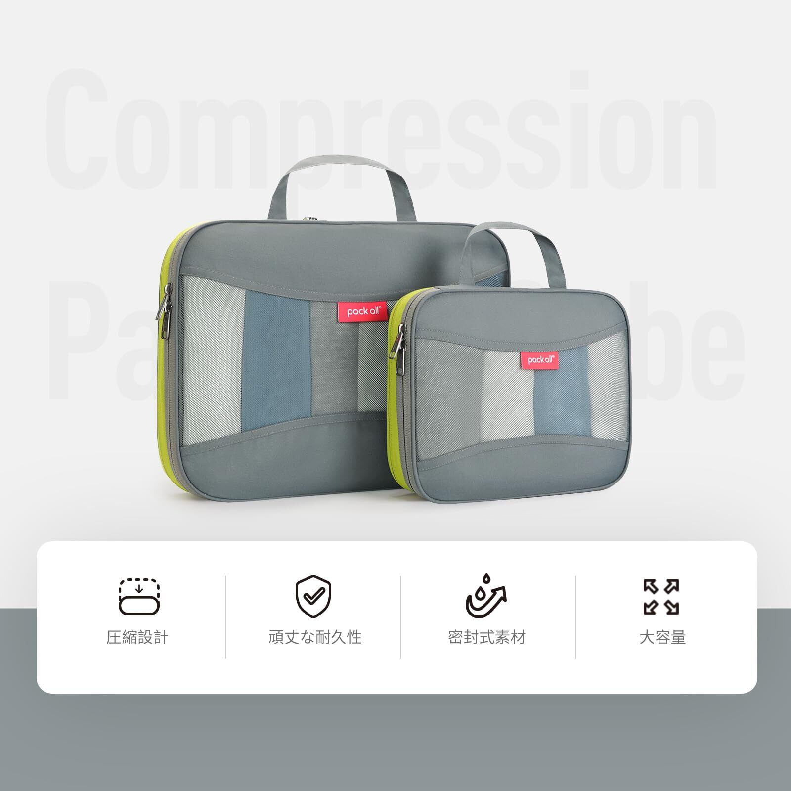 寸法:ご旅行または保管ニーズに合わせた二つのサイズが含まれております。Lサイズ圧縮時: 36x26x5cm, 拡張時: 36x26x10cm; Mサイズ圧縮時: 26x18x5cm 拡張時: 26x18x10cm