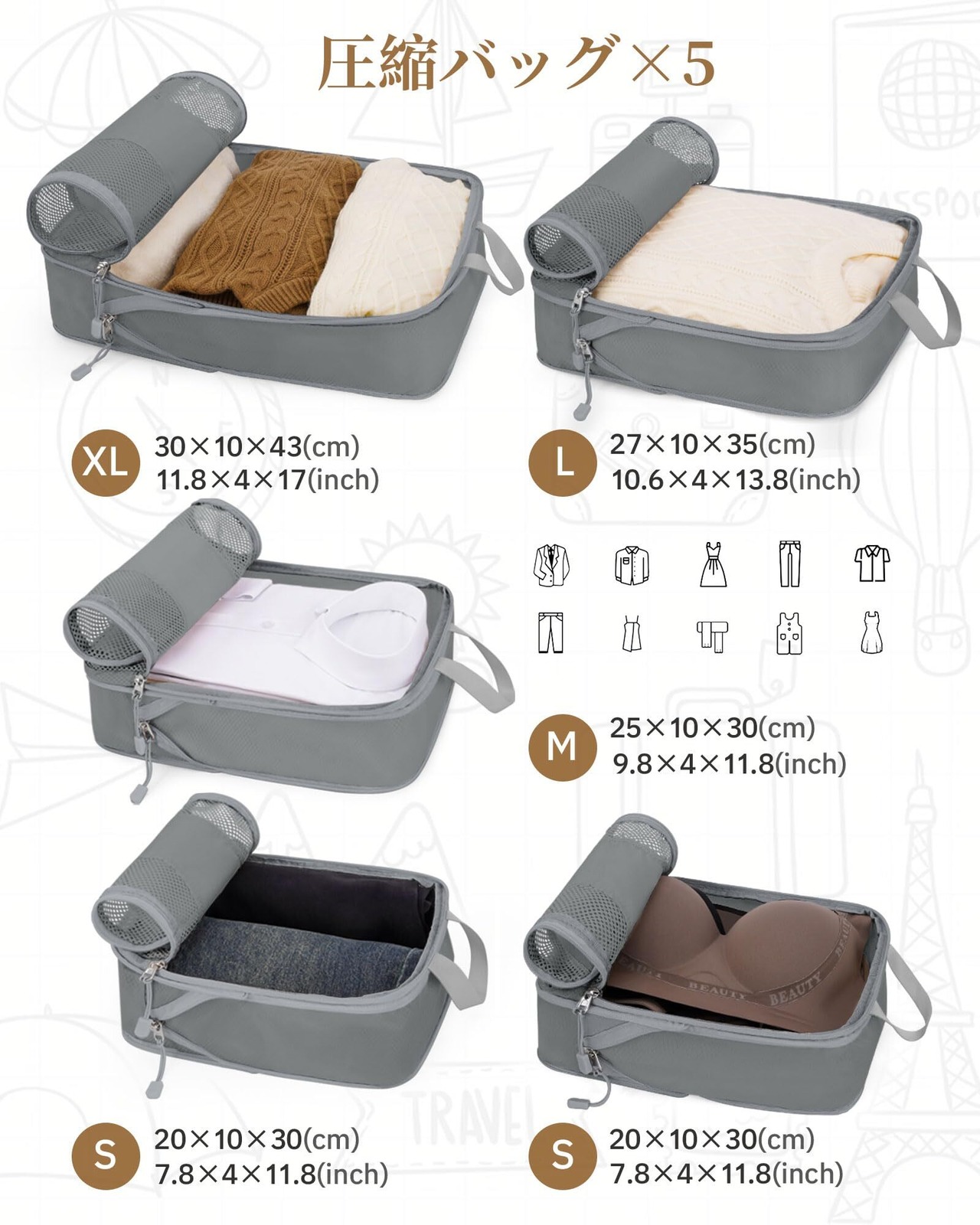 セット内容:便利な5点セット:圧縮バッグ×5(XL·L·M·S)。この1セットで十分、スーツケースのスペースを大幅に節約できます!