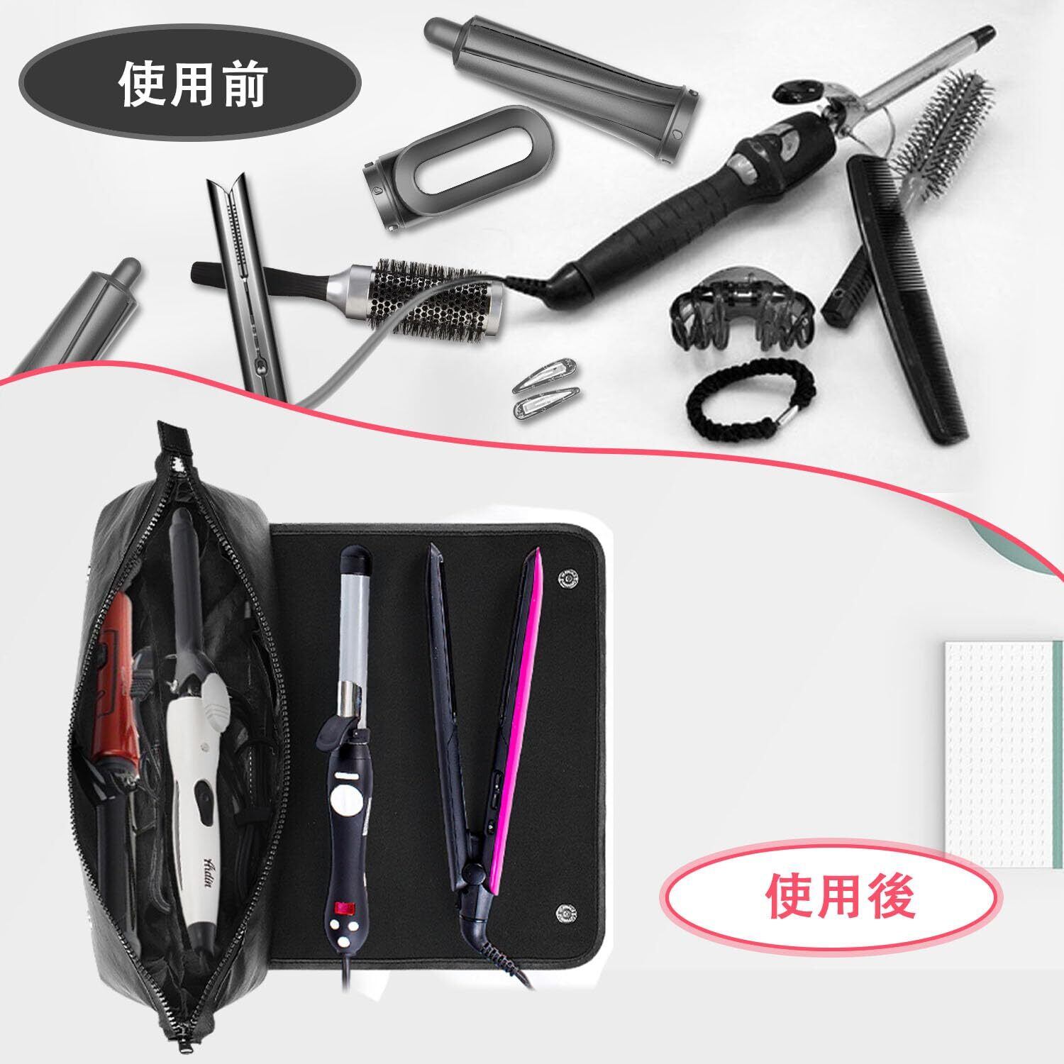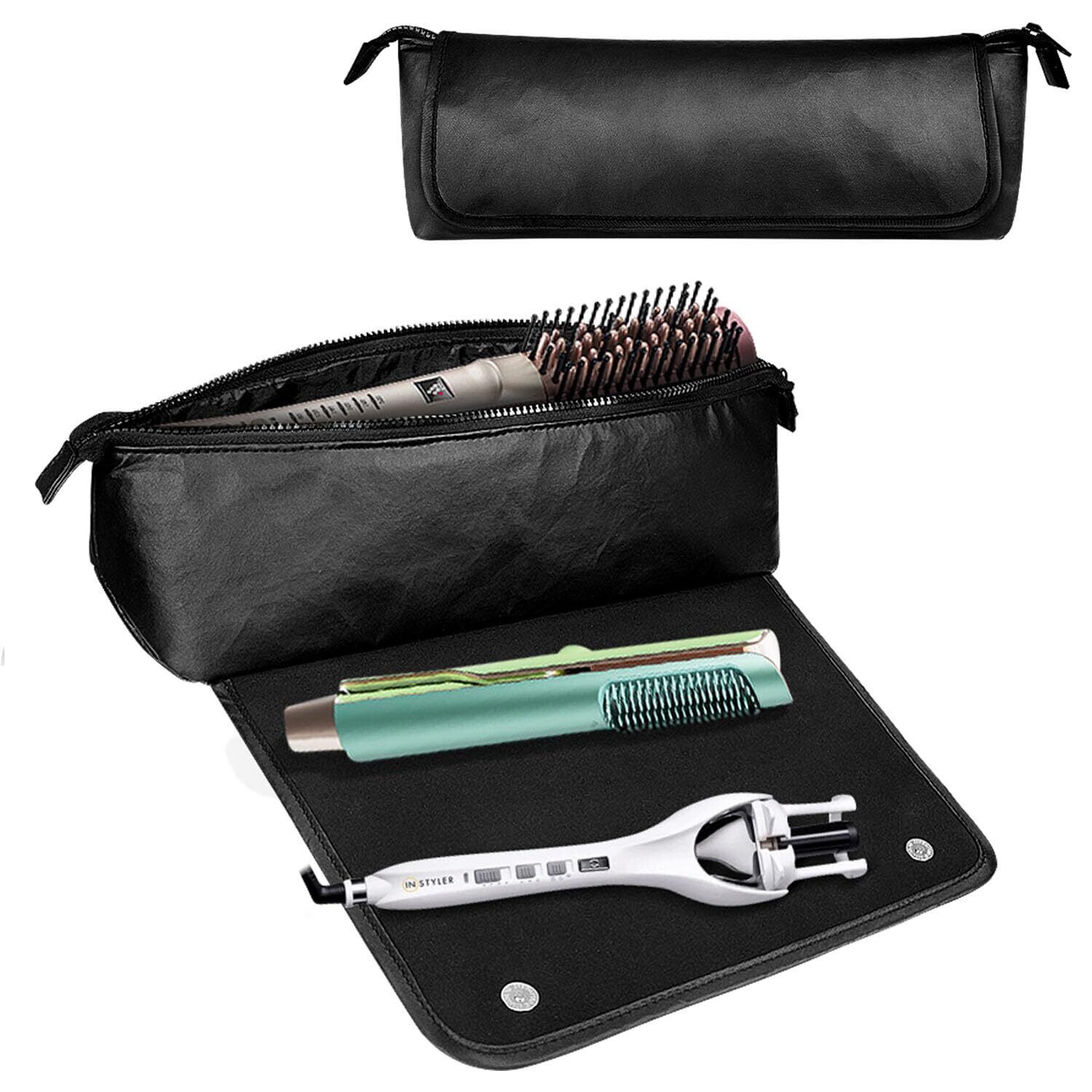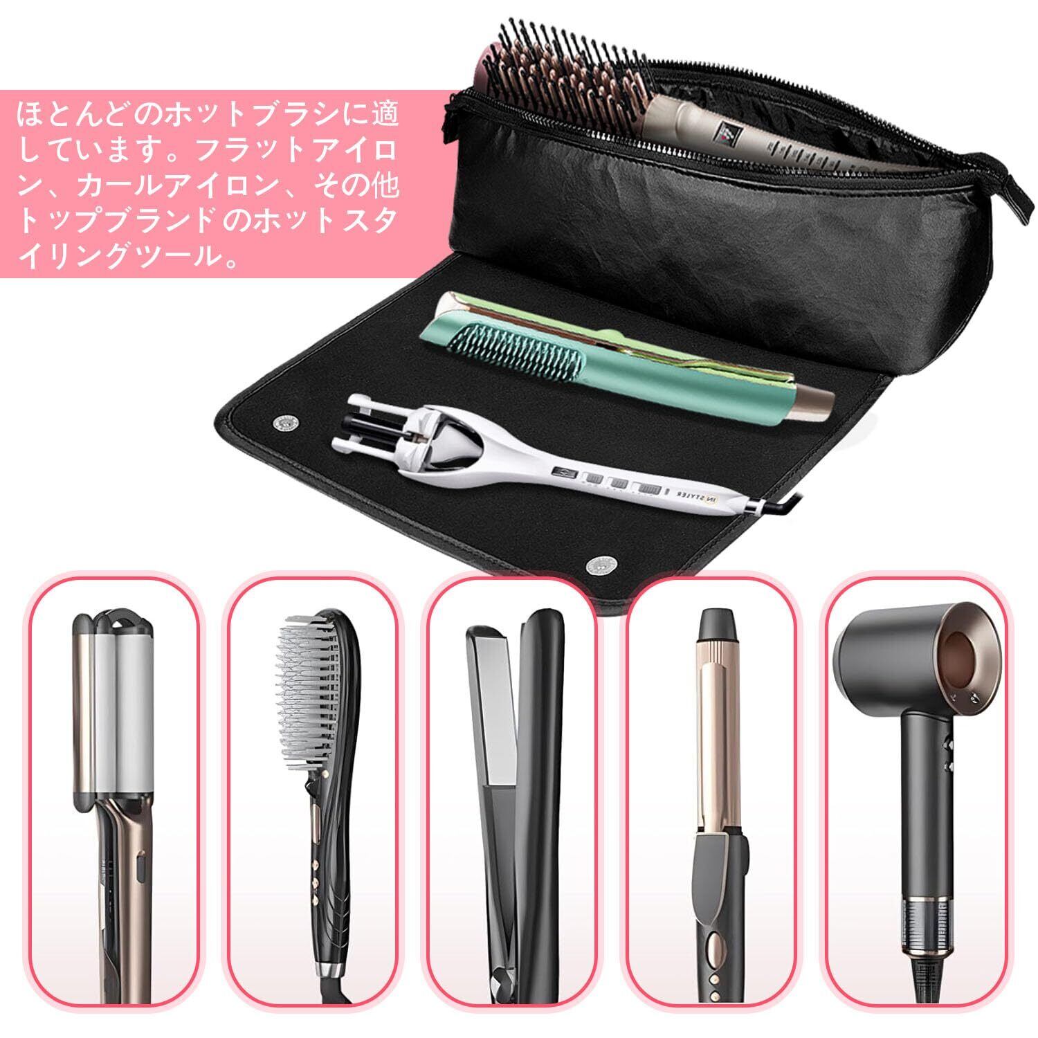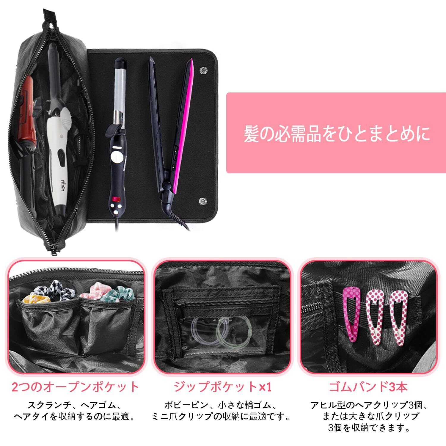 ヘアツール トラベル オーガナイザー バッグ 耐熱マット付き 2-in-1 トラベル キャリング ストレージ ケース フラットアイロン、ストレートアイロン、ヘアアイロン、ヘアドライヤー、スタイリングツール、ヘアケアアクセサリー用 (ブラック)