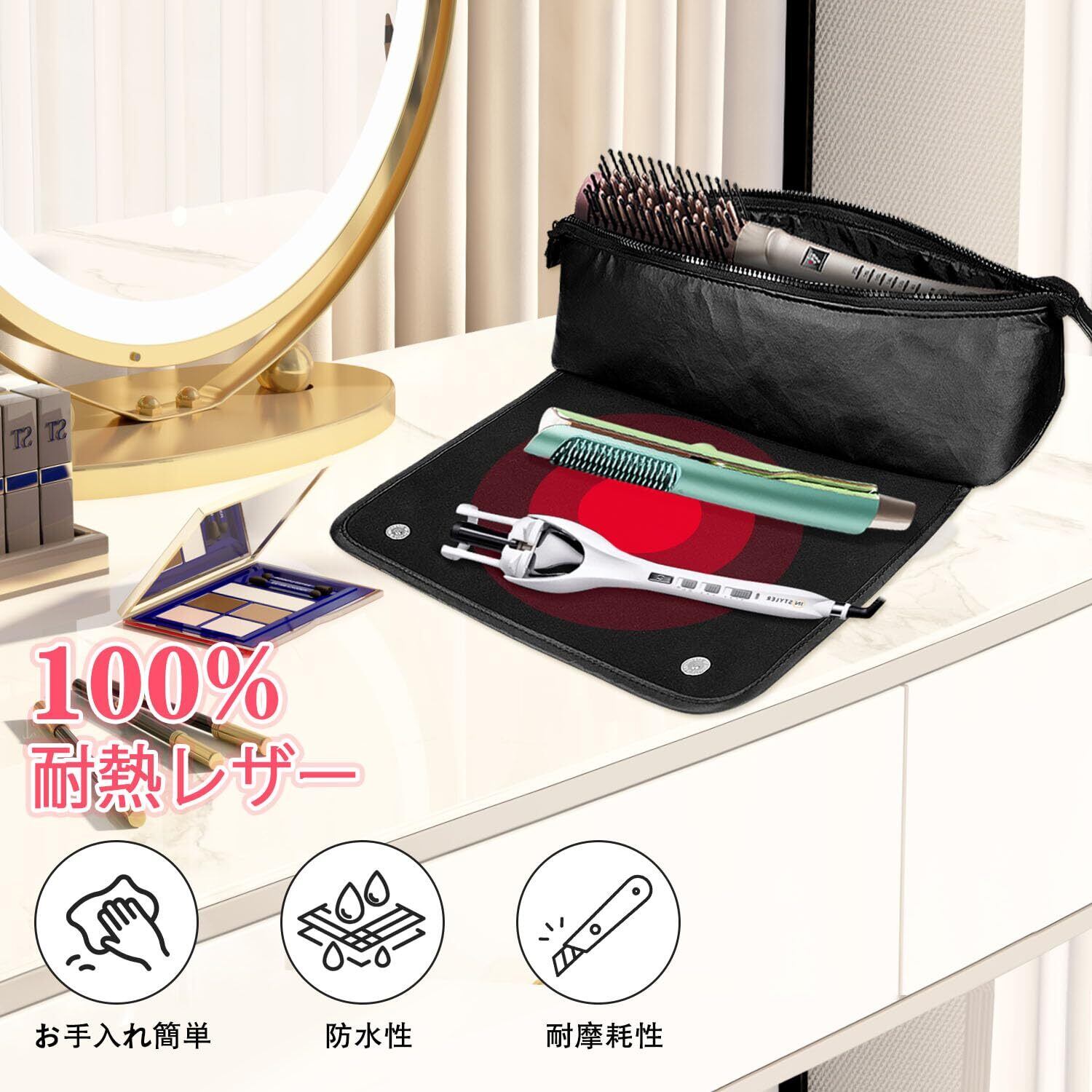 【100%耐熱インテリアマット】- このポータブルヘアツールバッグには、厚い二重層ネオプレン製の耐熱マットが付属しています。耐熱性と耐熱性を備え、高温のヘアツールに必要な保護を提供します。使用中は熱いツールを置き、片付ける時は冷ますことで、ドレッサーが損傷したり、可燃物と接触したりするのを効果的に防ぎます。また、火傷の危険からも身を守ります
