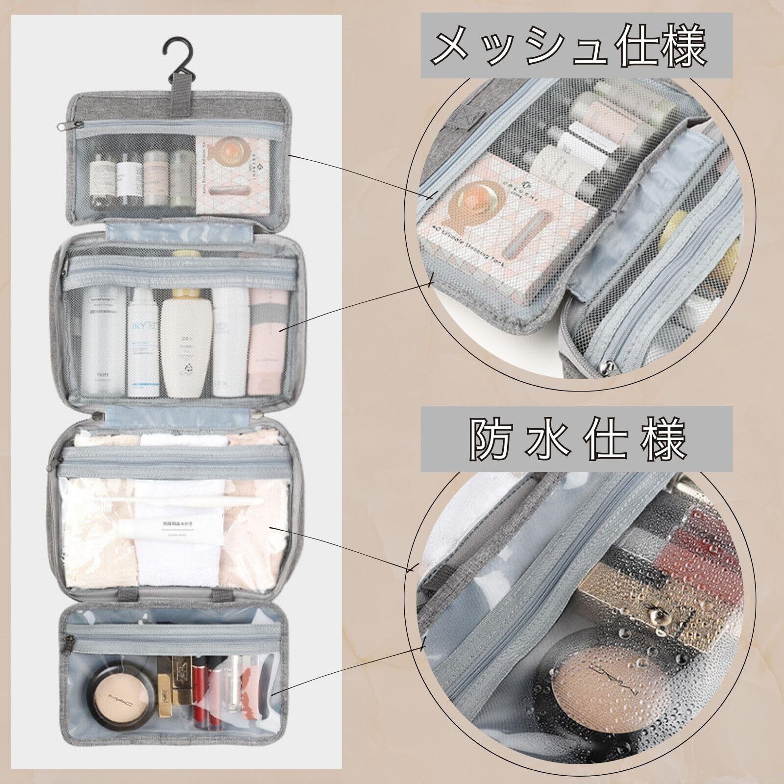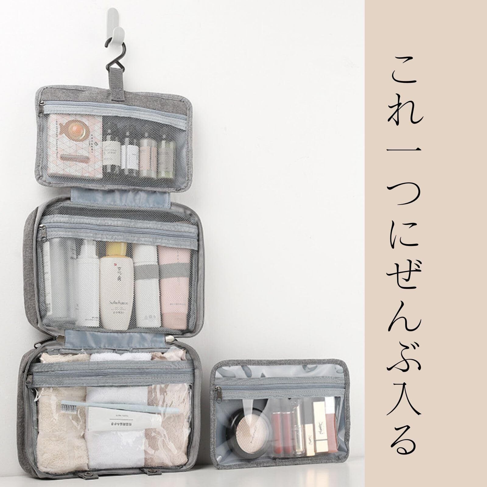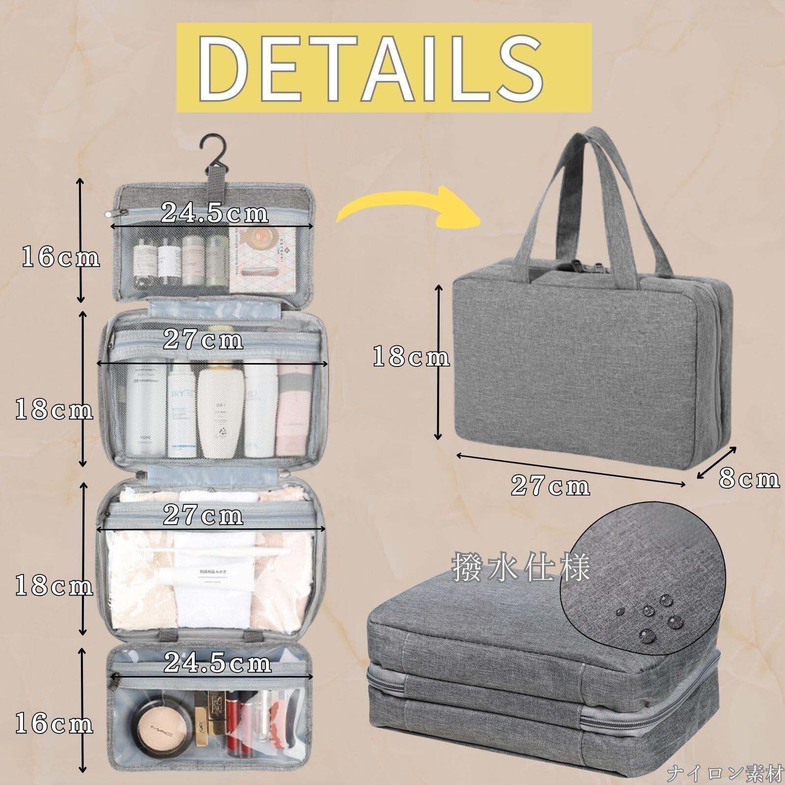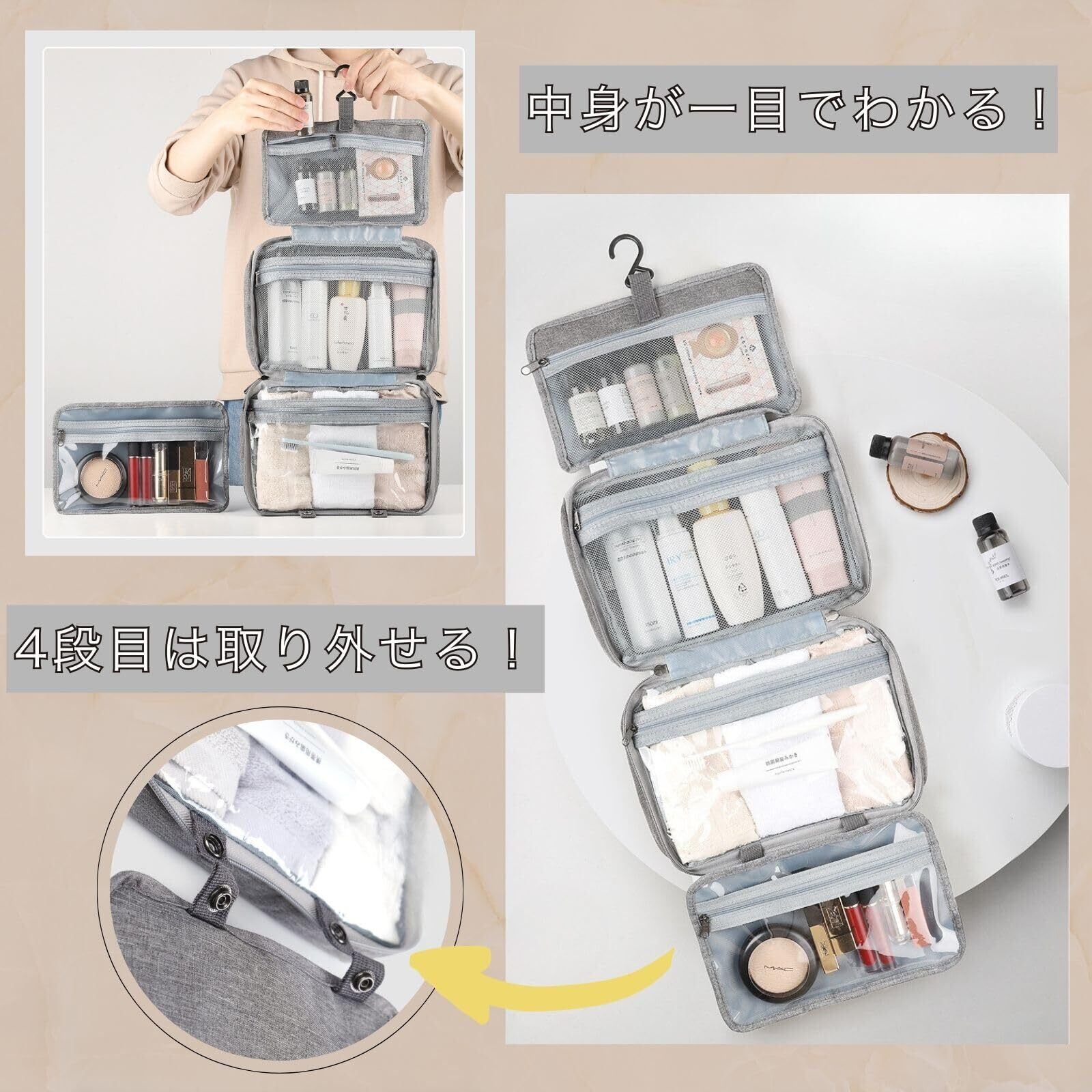 旅行や出張に便利な大きめメイクポーチ。スキンケアやメイク道具、シャンプー類までまとめられるトラベルバッグ。防水仕様で衛生的に使え、散らかりやすい小物もすっきり整理可能。日常のコスメ収納にも役立ちます。 ホテルやスパで化粧品が散らばるのが苦手な方におすすめ。吊るせるデザインだから洗面所でも省スペースで使いやすい。ジムやプール、短期旅行など幅広いシーンで活躍し、バッグインバッグ感覚で持ち運べる便利な収納ポーチです。 4層構造で整理整頓がしやすく、上部にはフック、二段目にはゴムバンド付きポケット、三段目四段目は防水ポーチ仕様。濡れ物や液体容器も安心して収納でき、取り外し可能な四段目は単体ポーチとしても活躍。軽量ナイロン素材で持ち運びも快適です。 洗面所に吊り下げればコスメや洗面具が一目で見やすく、すぐ取り出せます。普段はメイクポーチやバニティポーチとして化粧品収納に、旅行時はトラベルグッズとして大活躍。 本体は27×18×8cmとコンパクトながら収納力抜群。厚みのある生地でしっかり自立し、中身が見える透明ポケットとメッシュポケットを完備。必要なものを整理でき、使わない部分は取り外して身軽に持ち歩ける多機能トラベルポーチです。