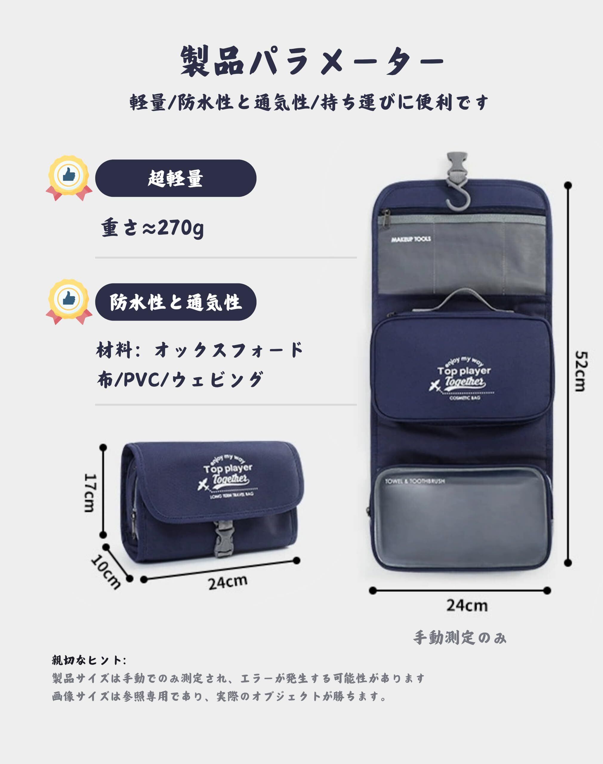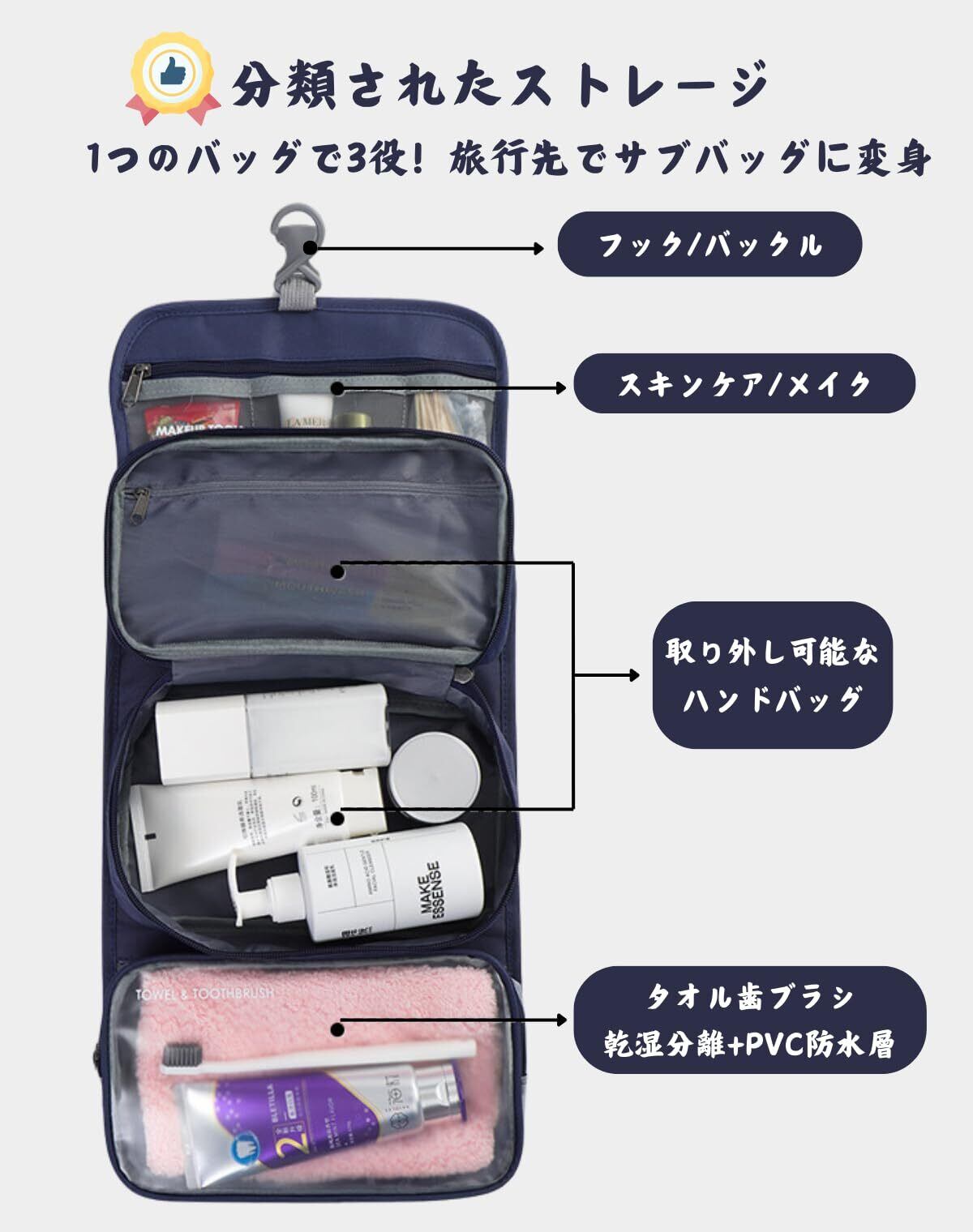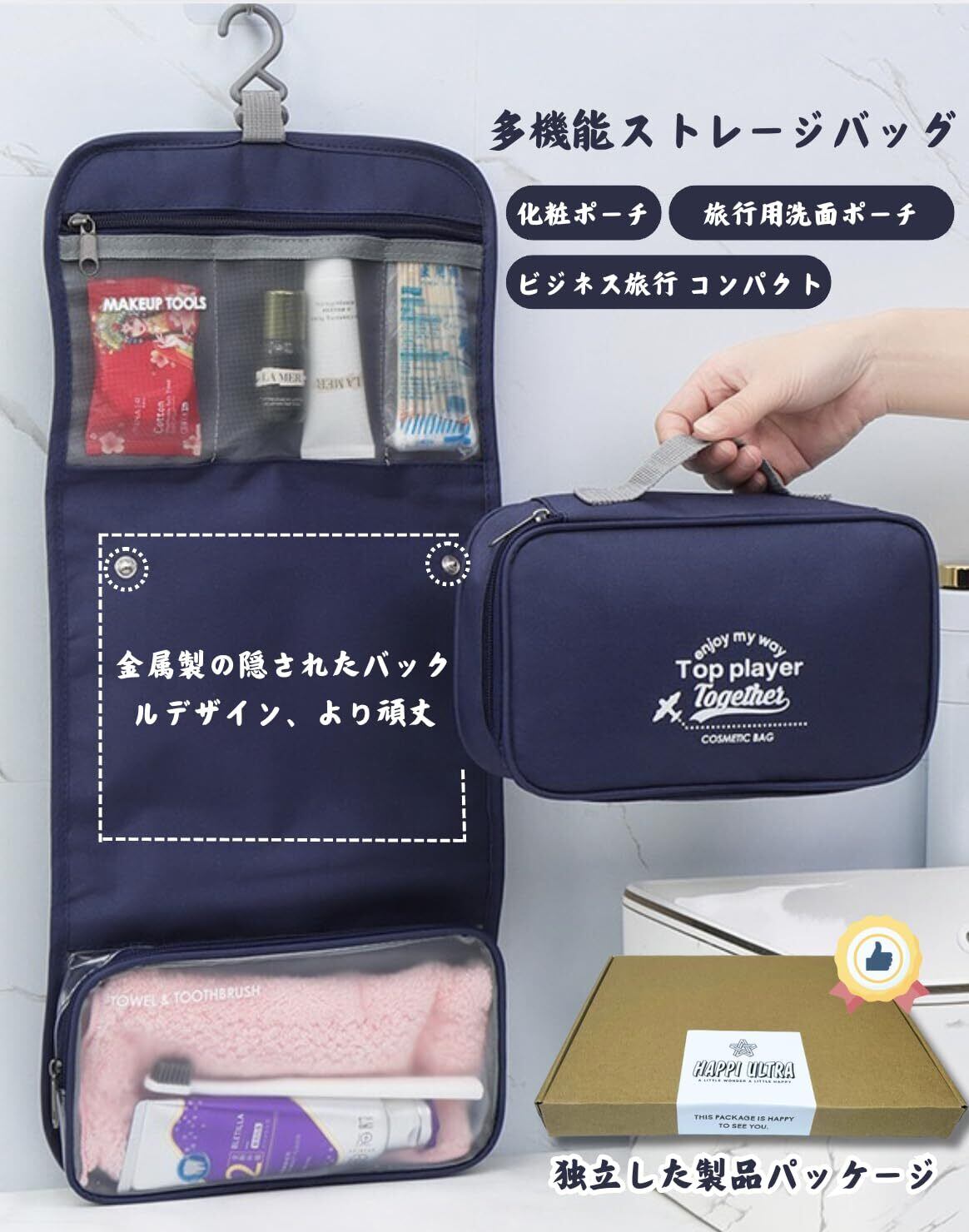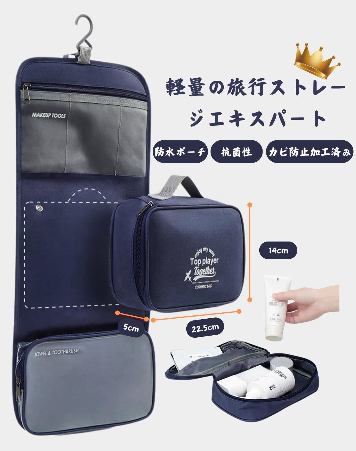 【在庫セール】超軽量 トラベルポーチ 吊り下げ 防水バッグ ポーチ 大容量 吊るせるポーチ メイクポーチ 旅行 スキンケアポーチ洗面用具 トイレタリーバッグ 取り外し可能 折りたたみ式 持ち運び 乾湿分離 出張 化粧品 収納 フック付き (ネイビーブルー) | 無意味ステッカー
