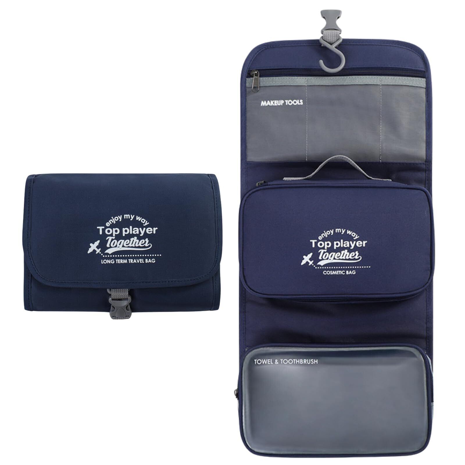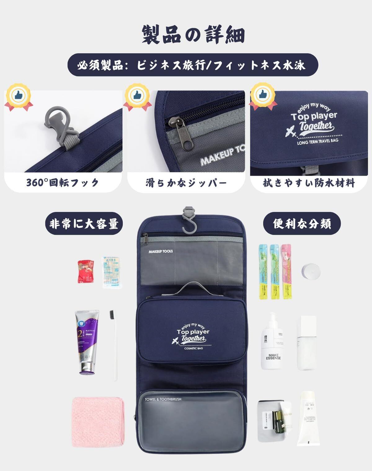 超軽量 トラベルポーチ 吊り下げ 防水バッグ ポーチ 大容量 吊るせるポーチ メイクポーチ 旅行 スキンケアポーチ洗面用具 トイレタリーバッグ 取り外し可能 折りたたみ式 持ち運び 乾湿分離 出張 化粧品 収納 フック付き (ネイビーブルー)