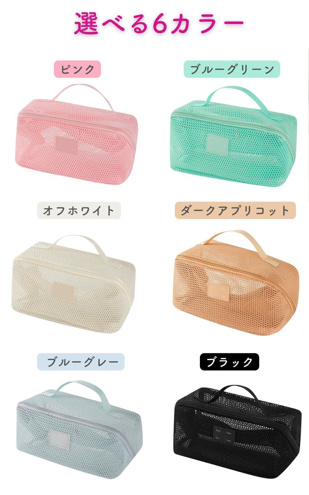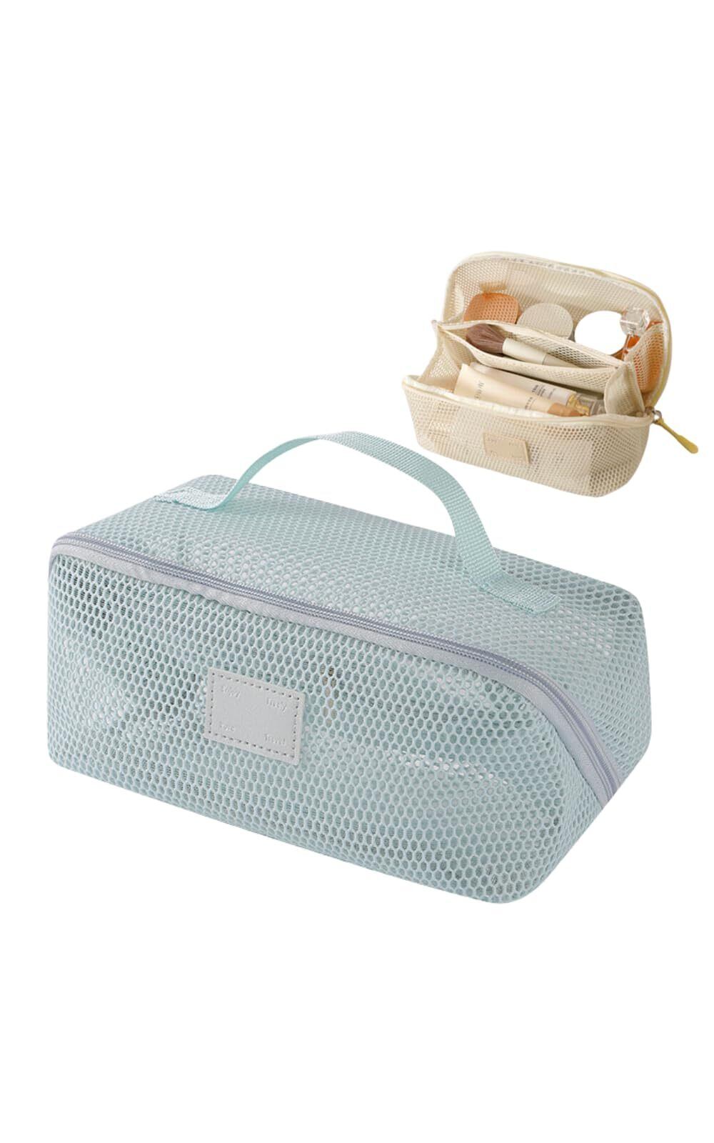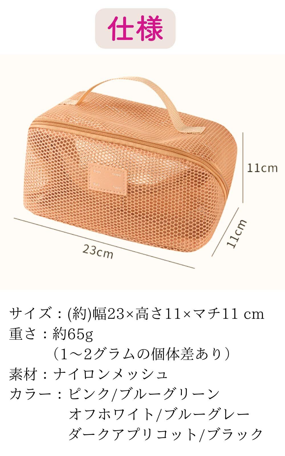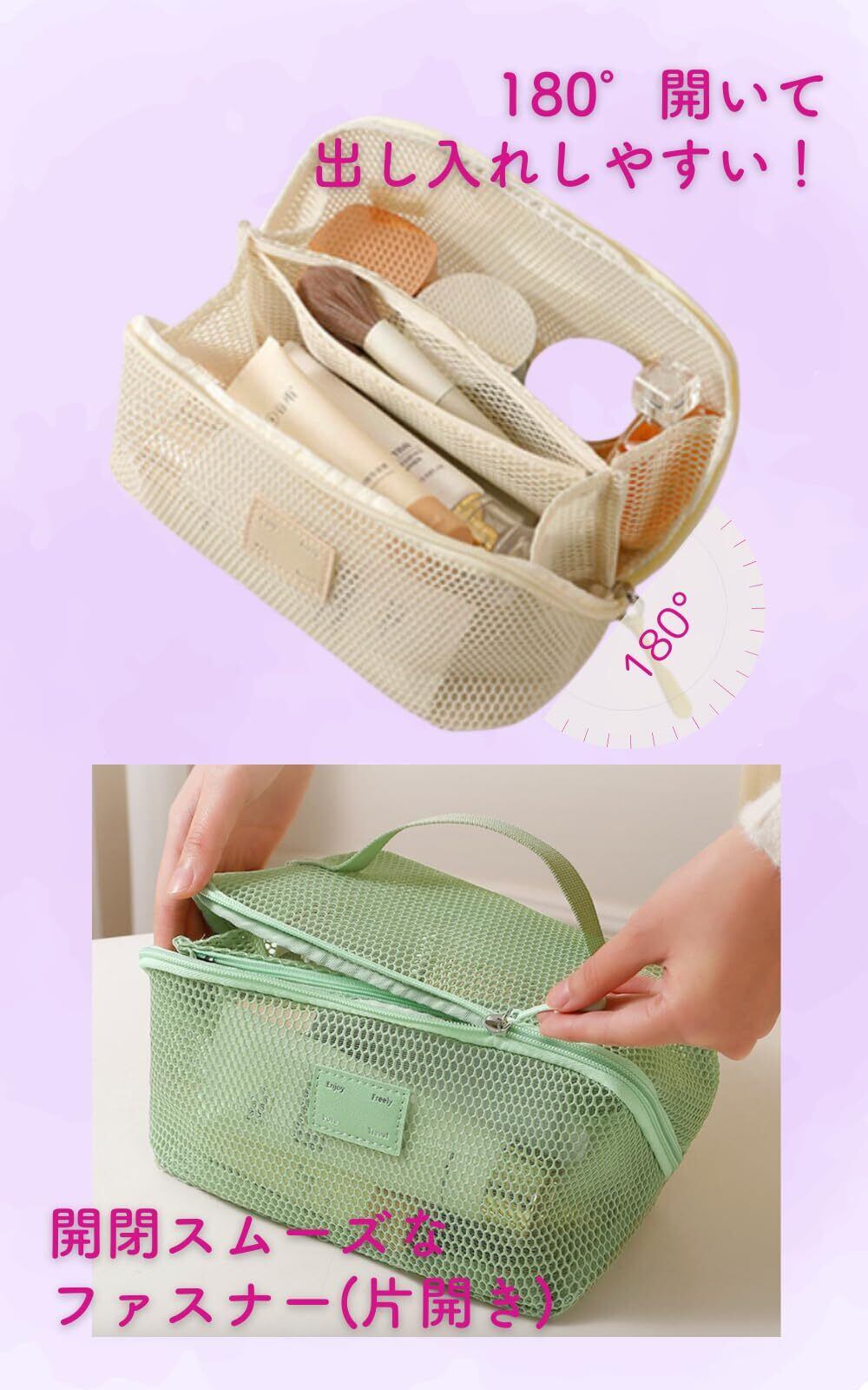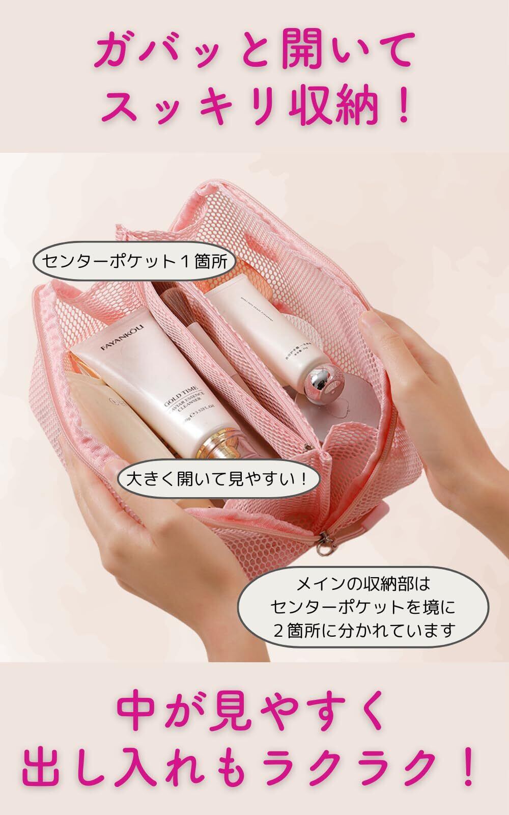 日常のコスメポーチとしてはもちろん、トラベルポーチ、スパポーチや温泉バッグとしても使えるメッシュポーチ。わずか65グラムと軽量ながら、たっぷりしたマチつきで大容量なのが魅力です。180度ガバッと開くので、中の物が見やすく整理しやすいのもポイント。洗濯可能なナイロンメッシュ素材なので、汚れを気にせず使えます。