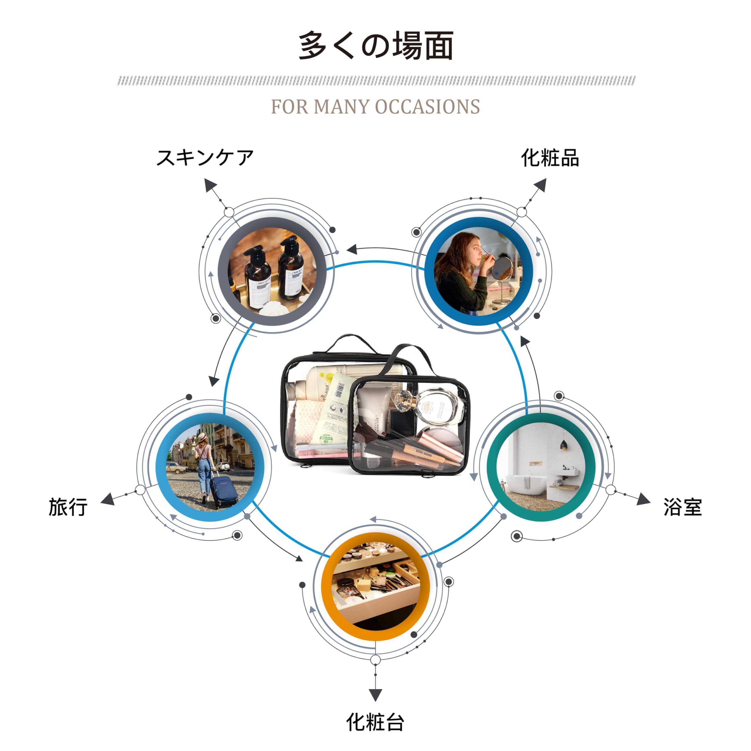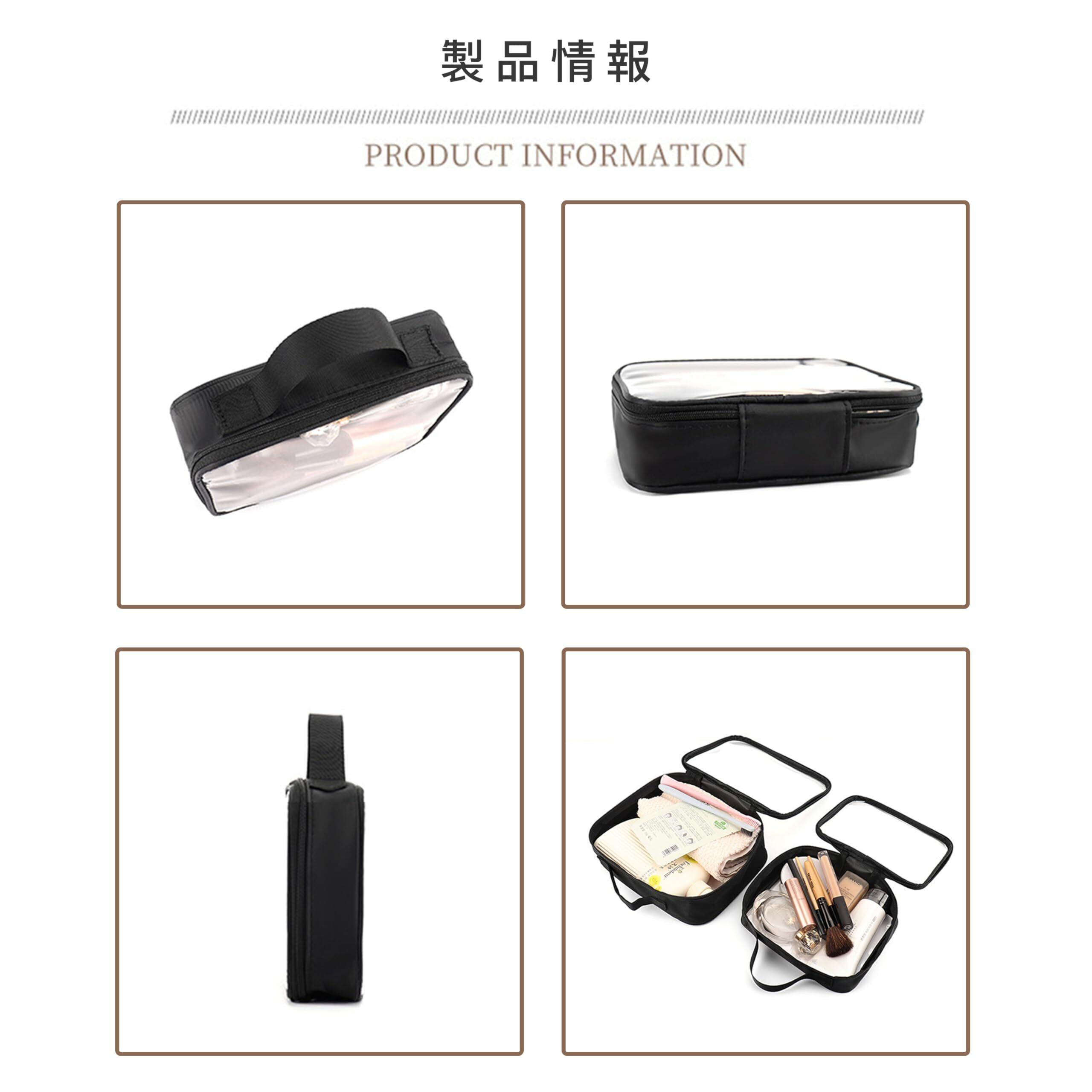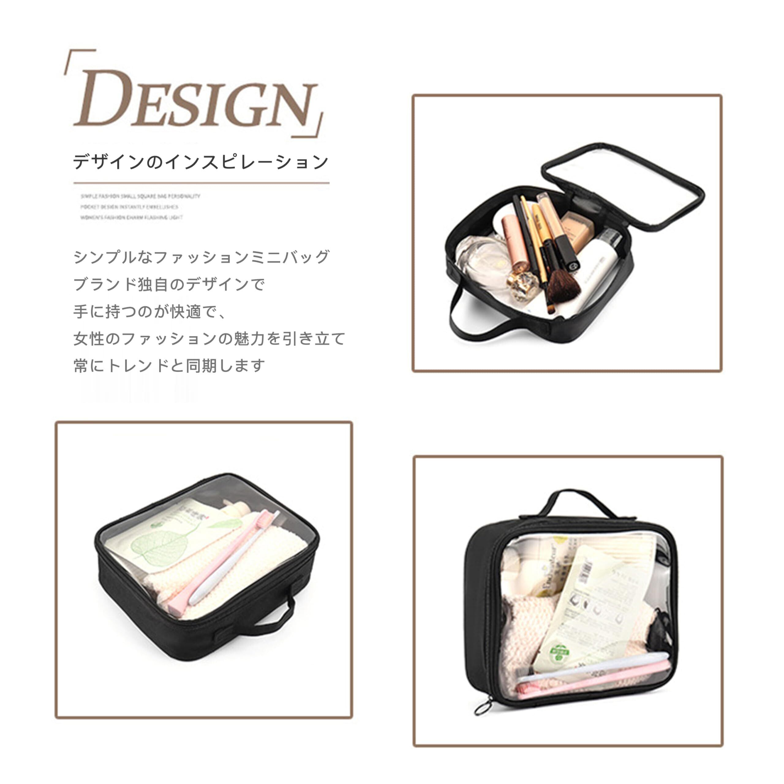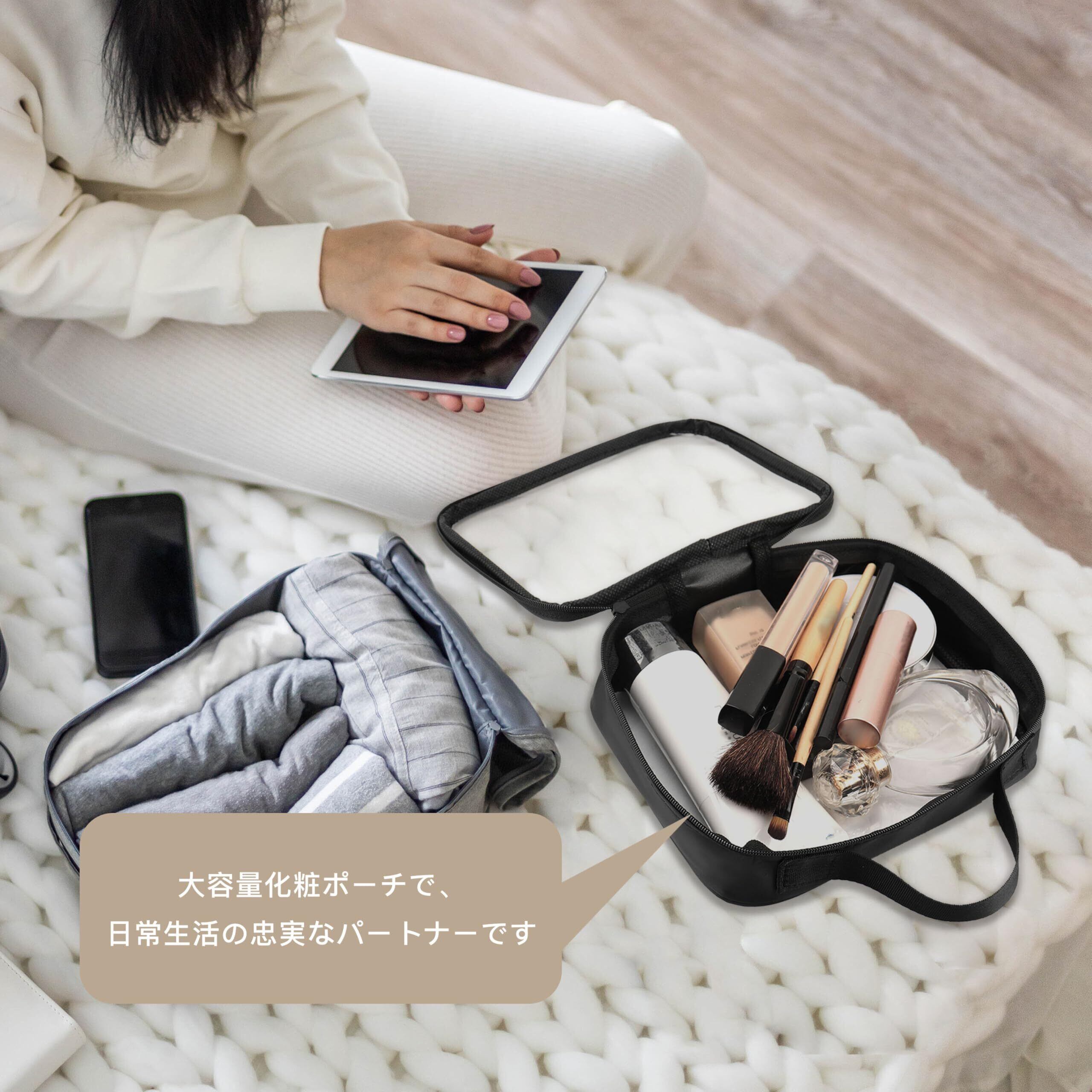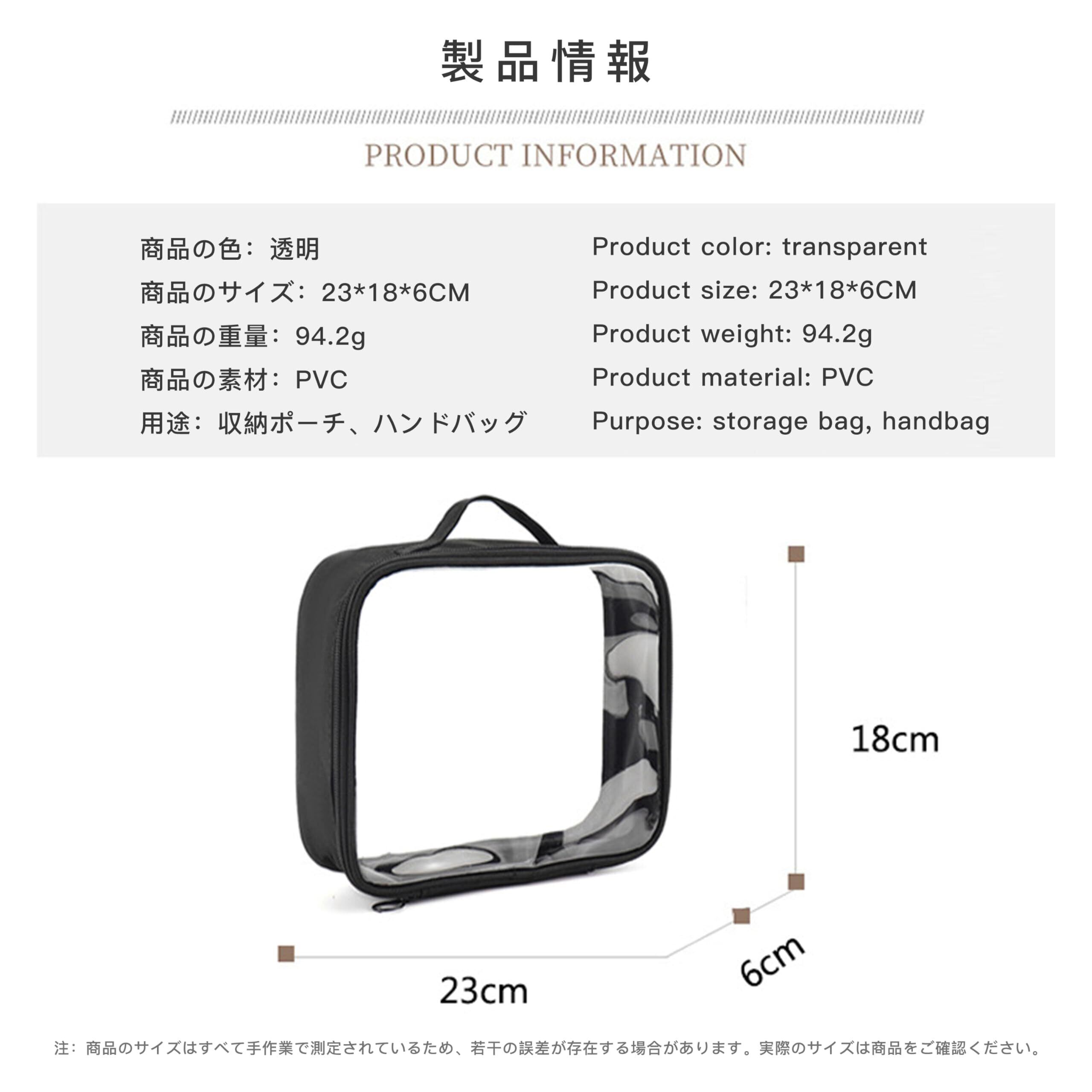 大容量&透明デザイン. サイズは23×18×6cmで、化粧品や小物類をすっきり収納できる大容量設計。透明なPVC素材を使用しており、中身が一目で確認できるため、取り出しが便利。