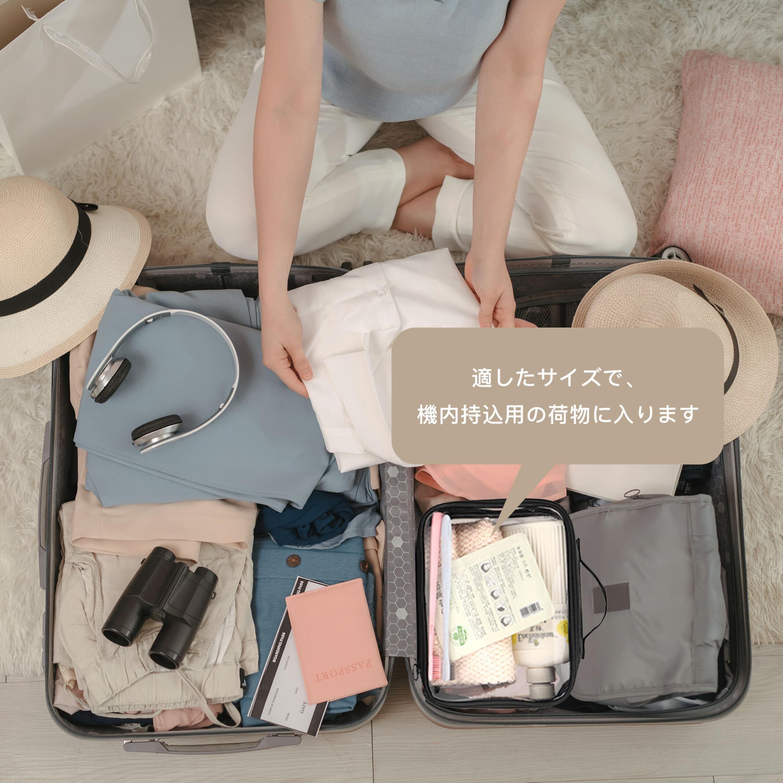TSA認証. 旅行用の液体収納袋はTSA認証を受けており、空港でのセキュリティチェックをスムーズに通過できる。液体類を安全に収納できるので、セキュリティの時間短縮にも貢献。
