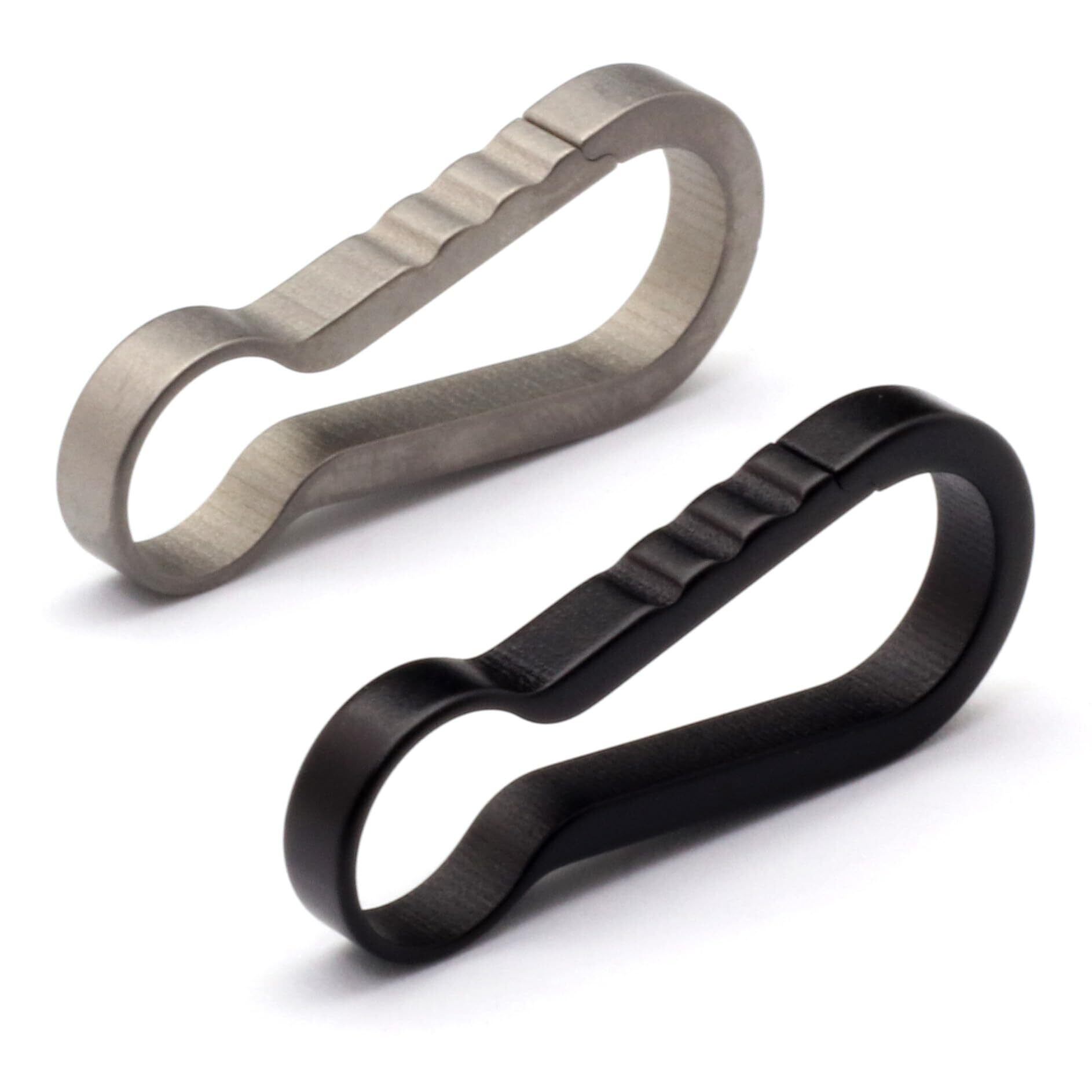 【バネのない一体成型仕上げの小型チタンカラビナ】強度と軽量性に優れたチタンのバネ性を活かし、つなぎ目のない一体成型で仕上げたカラビナ型キーホルダー。