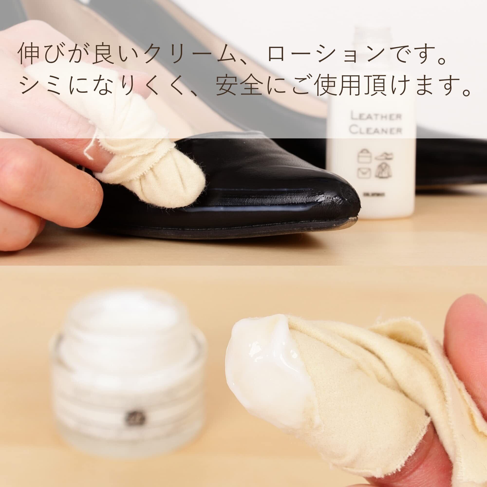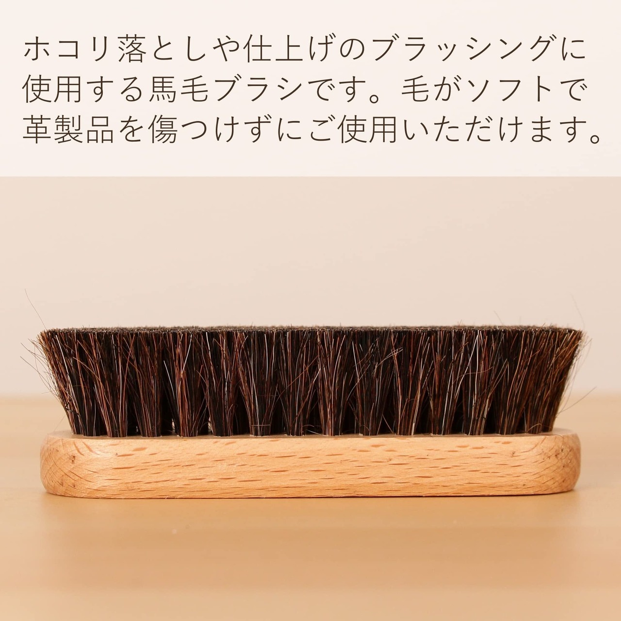 1.馬毛ブラシで表面のホコリを落とします。 2.レザークリーナーをクロスに取り、古いクリームや汚れを落とします。 3.ブリオレザーコンディショニングクリームを少量、クロスに取り、うすく全体に塗り伸ばします。 4.仕上げに馬毛ブラシでブラッシングして、クロスでよく磨いてください。
