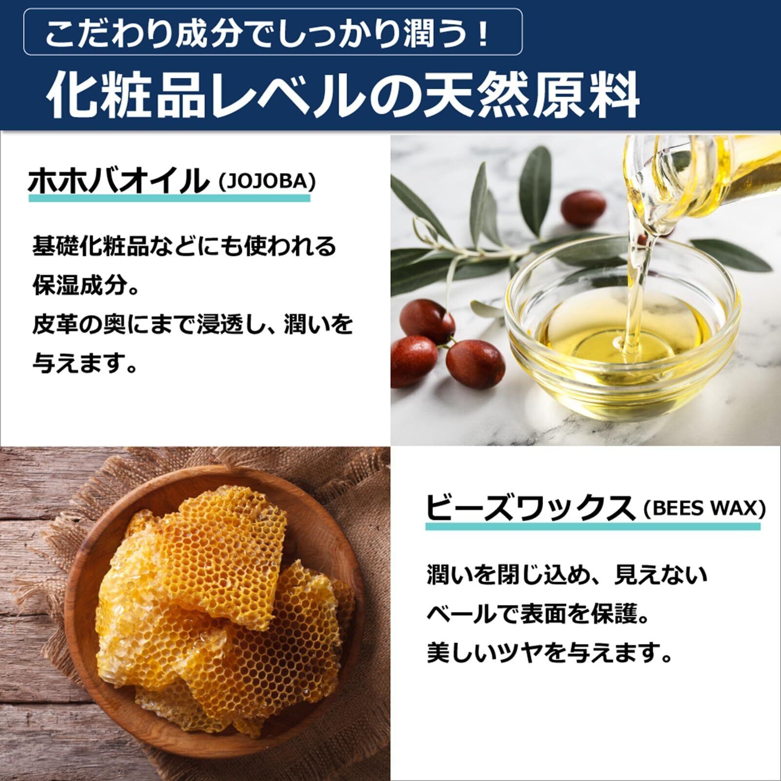 【化粧品レベルの天然原料を惜しみなく配合】天然原料の中でも最高級のものを選りすぐって使用。保湿効果が高いビーズワックス、ホホバオイルでかさついた皮革に潤いを取り戻し、美しいツヤを与え、皮脂などの汚れをしっかり落とします。とっさの雨や擦り傷などの保護にも効果があります。