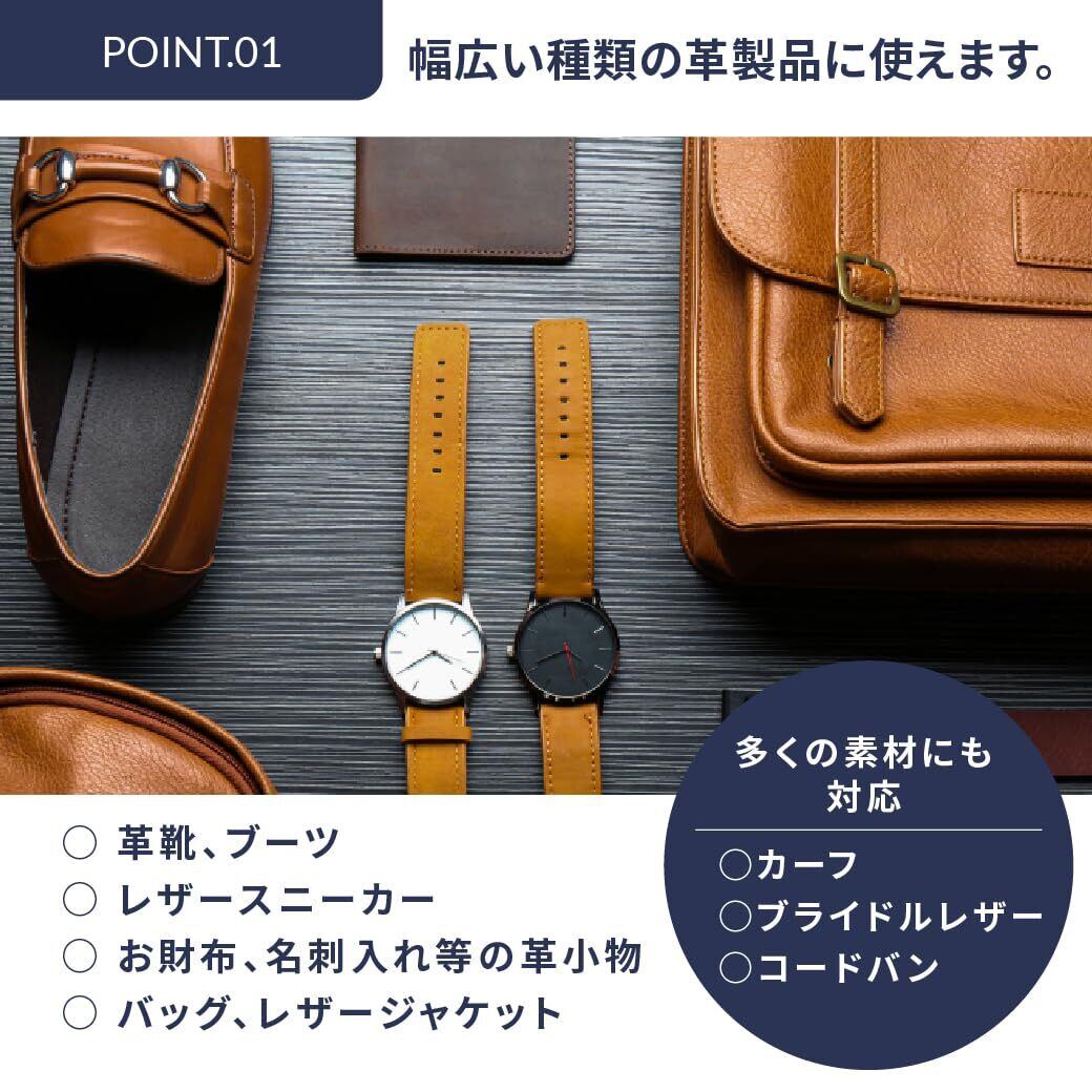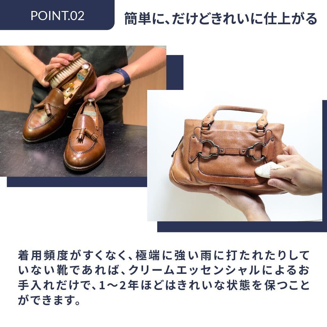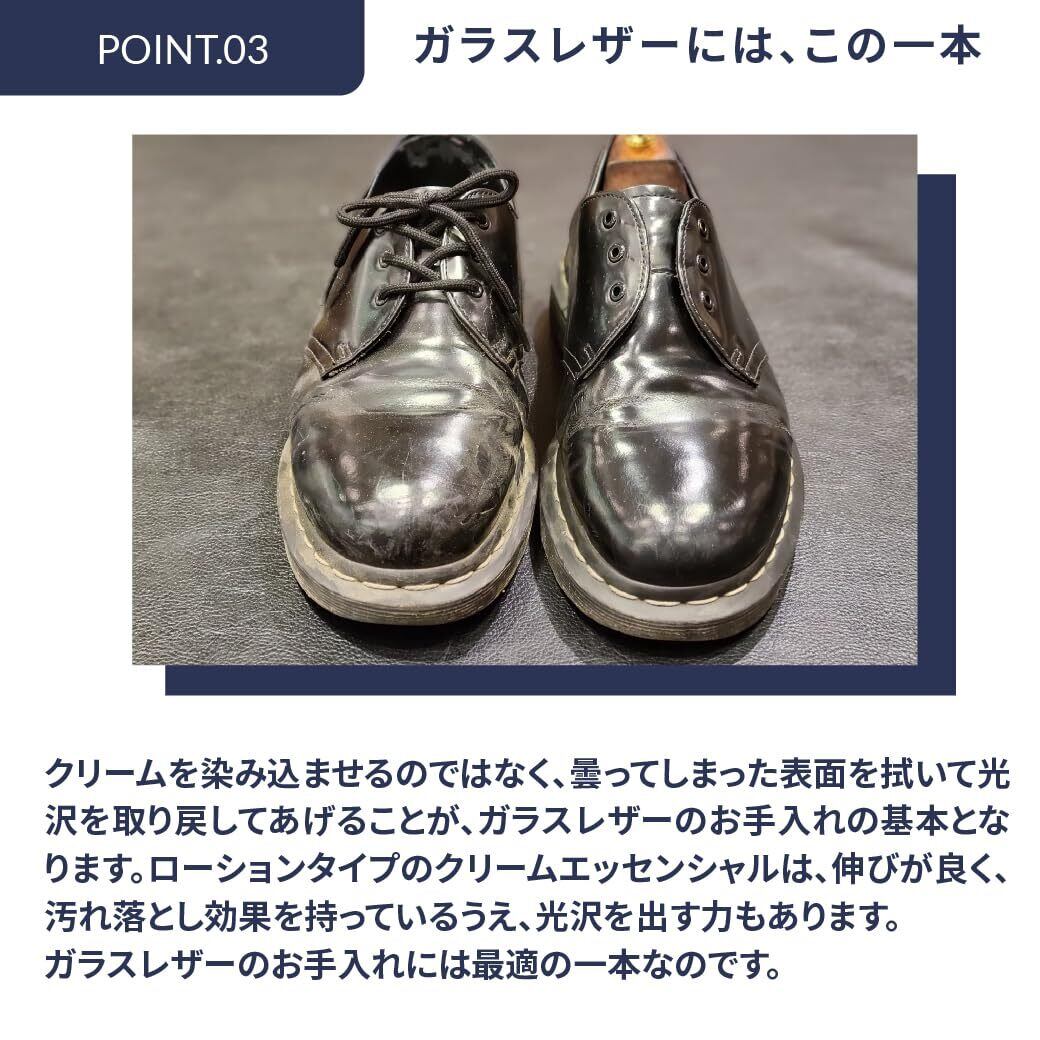 ●皮革に潤いと栄養を与えながら自然なツヤを与え、同時に表面についた汚れを落とします。●動物性油脂ラノリンの配合により皮革の柔軟性も維持します。●ビーズワックス(蜜ロウ)のエッセンスを配合したソルベントフリーの皮革用ナチュラルローションです。◆特にコレにおすすめ! ◆→ブーツ・バッグ・ウェアなどの面積の広い革製品皮革の表面をスゥ〜っとすべって行くなめらかさを是非実感して下さい。ちなみに・・・コードヴァンにもご使用いただけます! ! フタを閉めたまま容器をよく振り、柔らかい布にクリームエッセンシャルを適量含ませて軽く拭いてください。・乾拭きをして仕上げてください。※ご使用の際はあまり強くこすらないようにしてください。■注意●上記の用途以外には使用できません。●スエード、ヌバックなどの起毛皮革、ハ虫類皮革、シープ、ラム皮革製品には使用できません。●ヌメ革、ナッパ、アニリン染めの仕上げの皮革製品には使用できません。●新品のロウ(表面の白い粉)が残っている状態のブライドルレザーには、当製品は不要です。●ナチュラルな天然油脂を使用していますがアレルギー対策商品ではありません。●子供の手の届かない所に保管して下さい。●色落ち、シミ、色ムラ、変色する特殊な皮革もありますので、予めご了承の上、目立たない部分でテストしてからご使用ください。●クリームエッセンシャルは少量使用してください。多く使ってしまうと表面に成分が白く残ってしまう場合があります。●使用後は仕上げに必ず馬毛ブラシと柔らかい布を使用してください。●成分が表面に残ってしまった場合は水性クリーナーを使用してください。