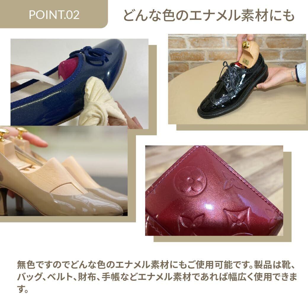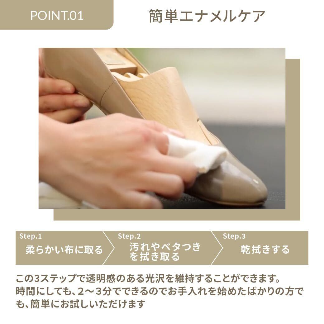 ●べたつき防止 革の特性上、表面が酸化するとベタツキが発生します。 お手入れをすることで透明な保護膜が張り、ベタツキからエナメルを守り、寿命を延ばします! ●エナメル簡単クリーナー 塗って乾拭きするだけの超簡単お手入れ! ! エナメル素材を傷めずに表面上の汚れを取り除き、ツヤ感を与えます! まるで新品の輝き! さらに、表面をきれいに保ちながらホコリも付着しにくくなります。無色なので何色のエナメルにも対応できます。●革小物にも靴にはもちろんのこと、財布やバッグなどのエナメル素材の小物にも使用可能! べたつきやすいエナメルも定期的なケアをすることで長く付き合っていけます!