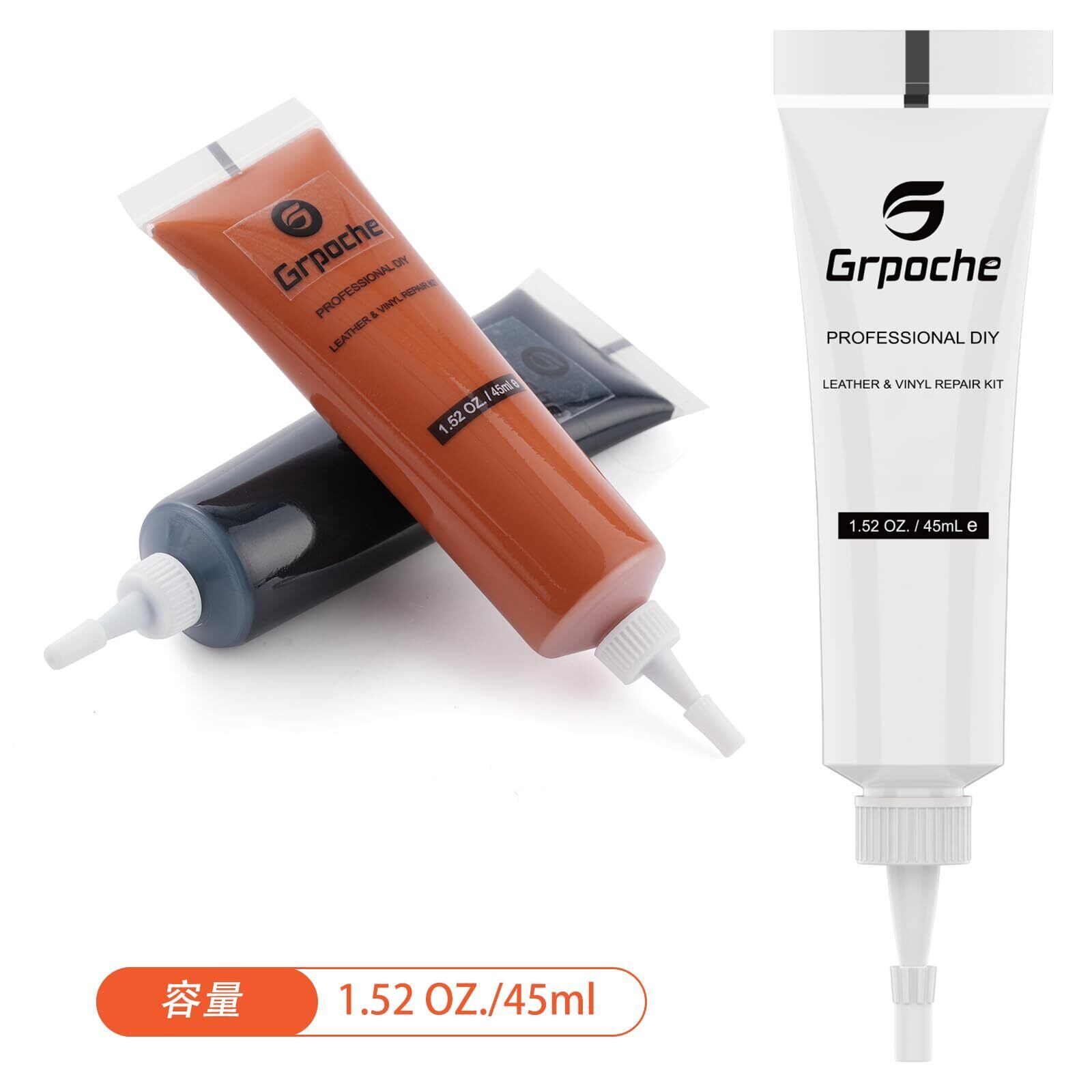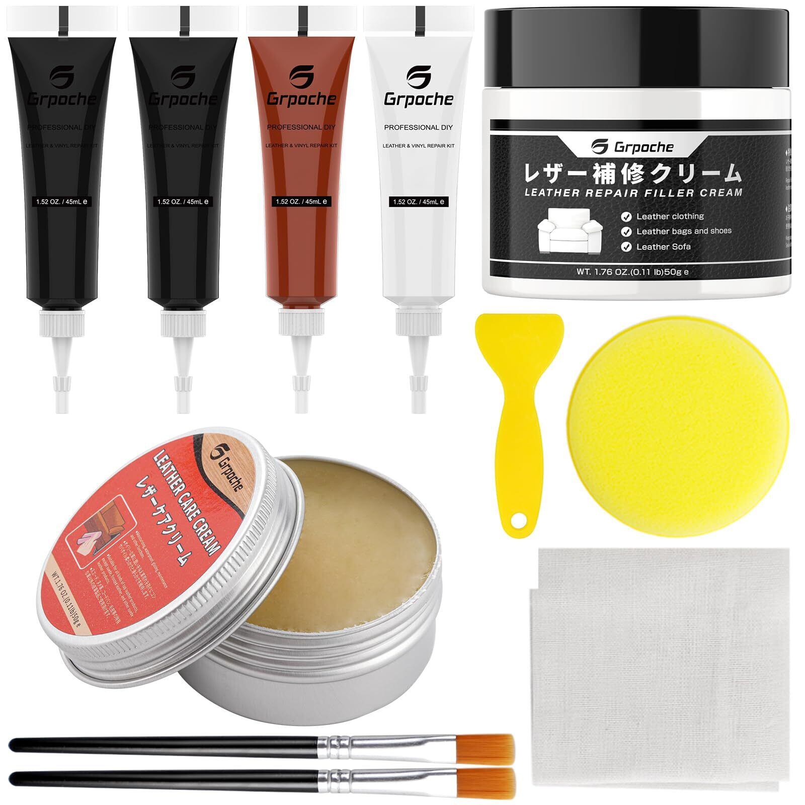 [grpoche] 革 補修 レザー&ビニール補修キット レザー補修クリーム 45ML ひび割れ 焼けた穴 傷の修復 あらゆる素材の修復 保革 修復 補色 保護 皮革用接着剤 ブラシ2付き ヘラ付き スポンジ付き ファイバークロス付き