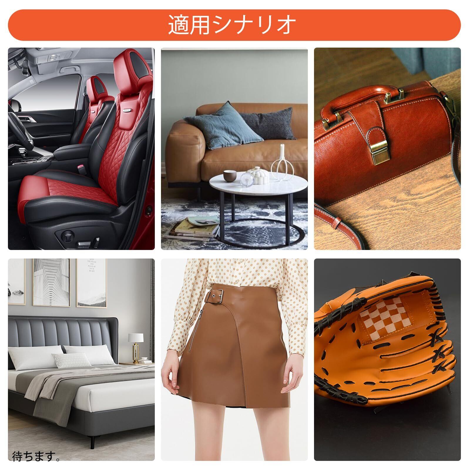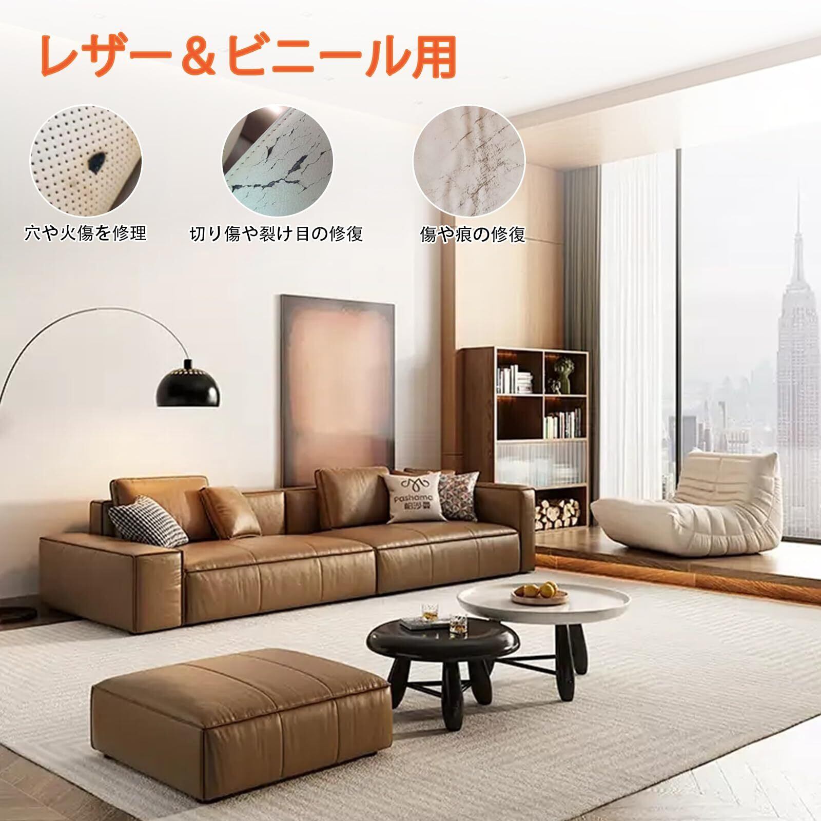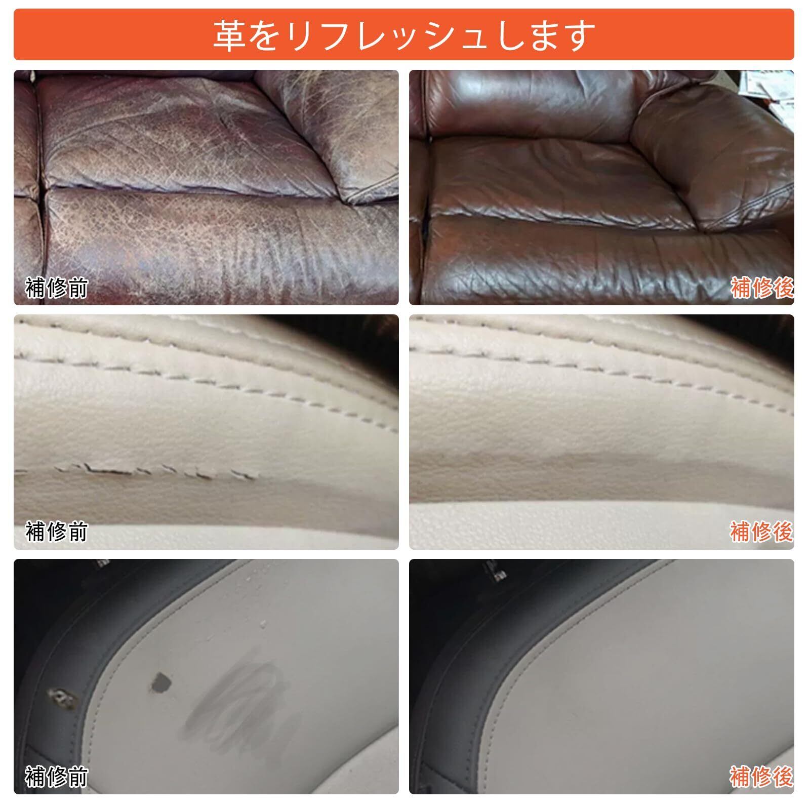 【適用範囲】ソファ、椅子、車のシート、ベルト、財布、靴、ブーツ、コート、バッグ、スーツケースなどの革製品や人工皮革製品のキズ、穴、焼け、ひび割れなどの補修効果があります。