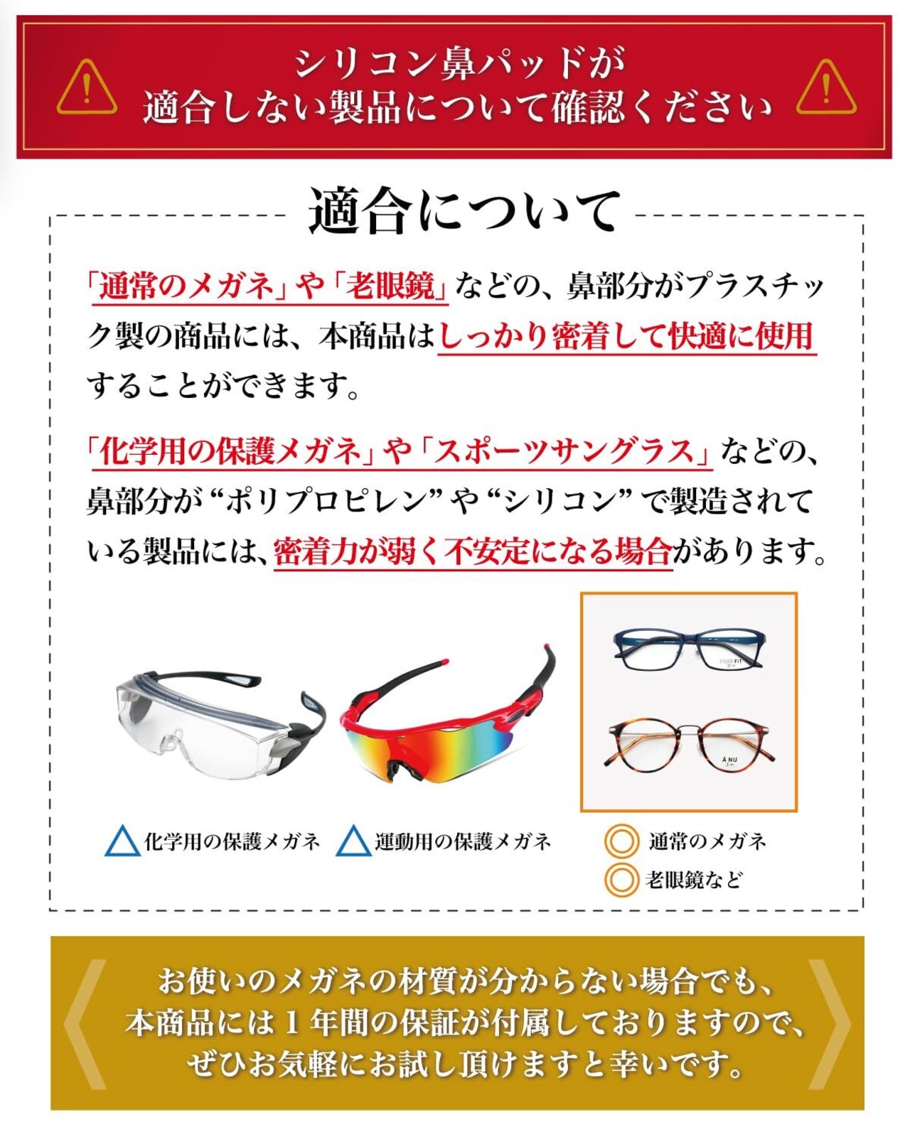 【注意事項】 「科化学用の保護メガネ」や「スポーツサングラス」などの鼻部分が”ポリプロピレン”や”シリコーン”で製造されている製品には、密着力が弱く不安定になる場合がございます。 お手持ちのメガネの材質確認のうえ、お買い求めください。
