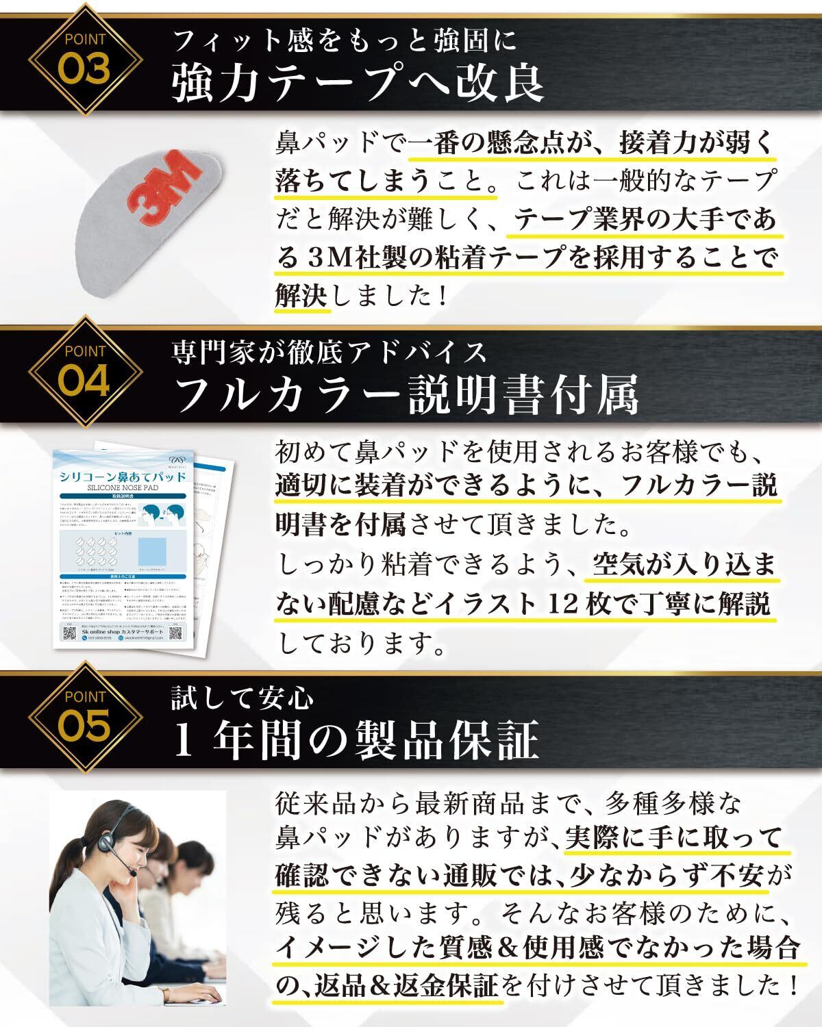 【こだわり】 ノーズパッド を製造している20社以上の中から品質、機能を共に追及して頂いた メガネ 備品専門工場と提携しております。 数あるサンプルの中から、接着機能にこだわり 3M製両面テープ を採用しました。