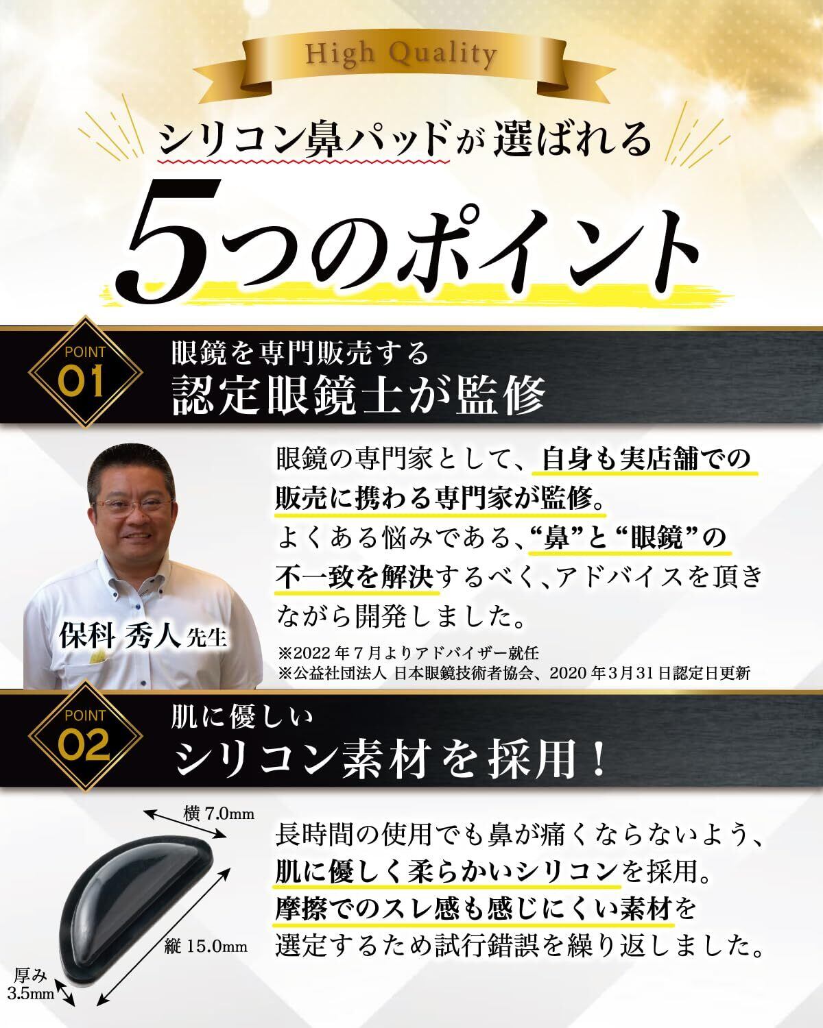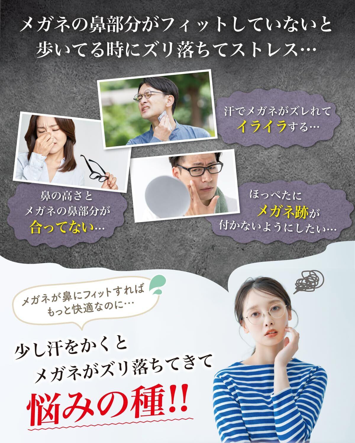 【認定眼鏡士が監修】汗でずり落ちてイライラする、鼻の高さと 眼鏡 の高さが合っていない、 メガネ 跡 が気になる、そんなお声から累計20万人以上の”目”に携わってきた専門家の監修の元、フィット感、快適さを追求した 鼻パッド です。