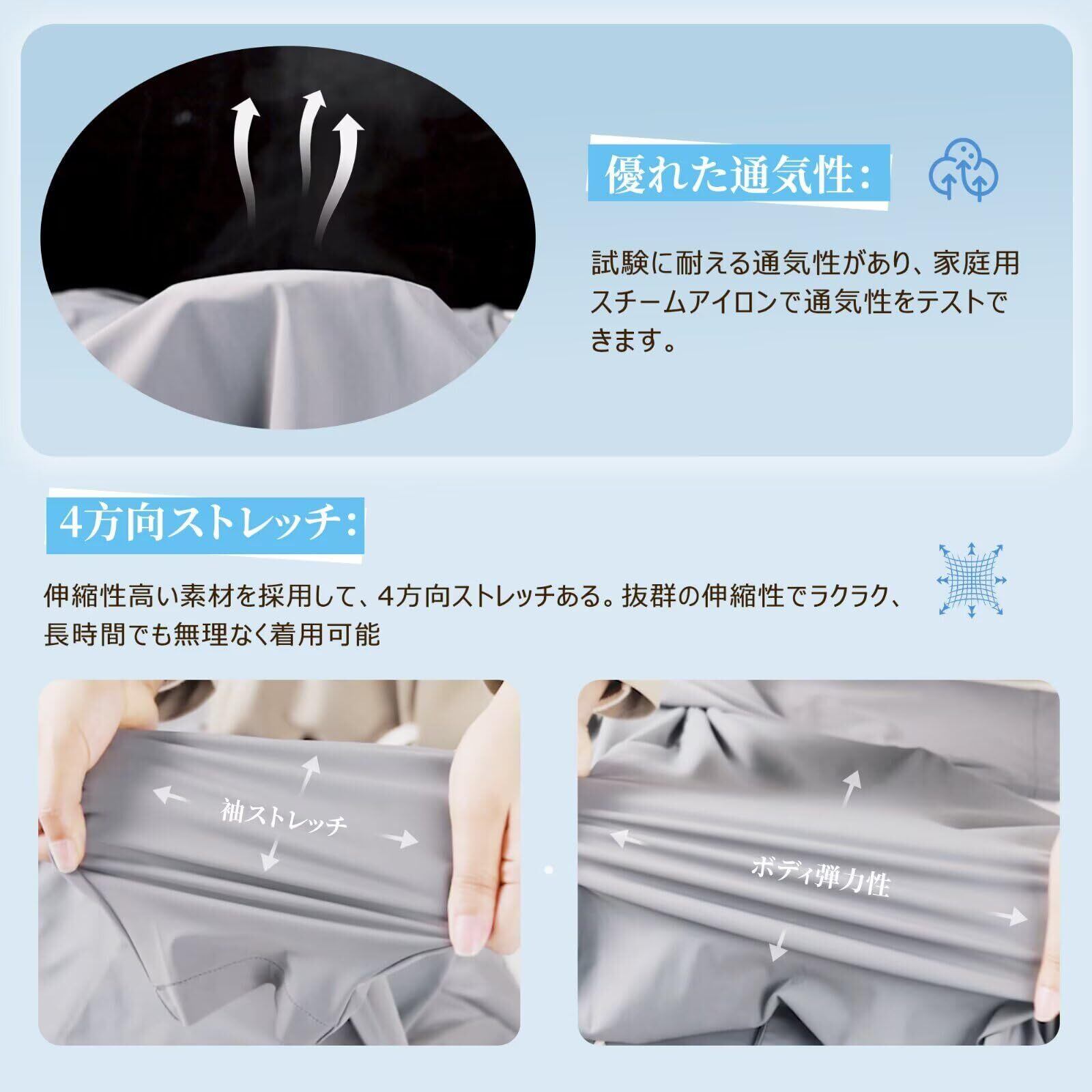 【商品特徴】冷感:着るとすぐに涼しさを感じ、さらに日焼け止め効果も兼ね備えています。4方向ストレッチ:前でも後ろでも袖でも、非常に良い弾力性があります。吸汗速乾:相当良好な吸汗性と速乾性で、もう夏の汗が服に張り付く心配はありません。軽量通気:試験に耐える通気性があり、家庭用スチームアイロンで通気性をテストできます。