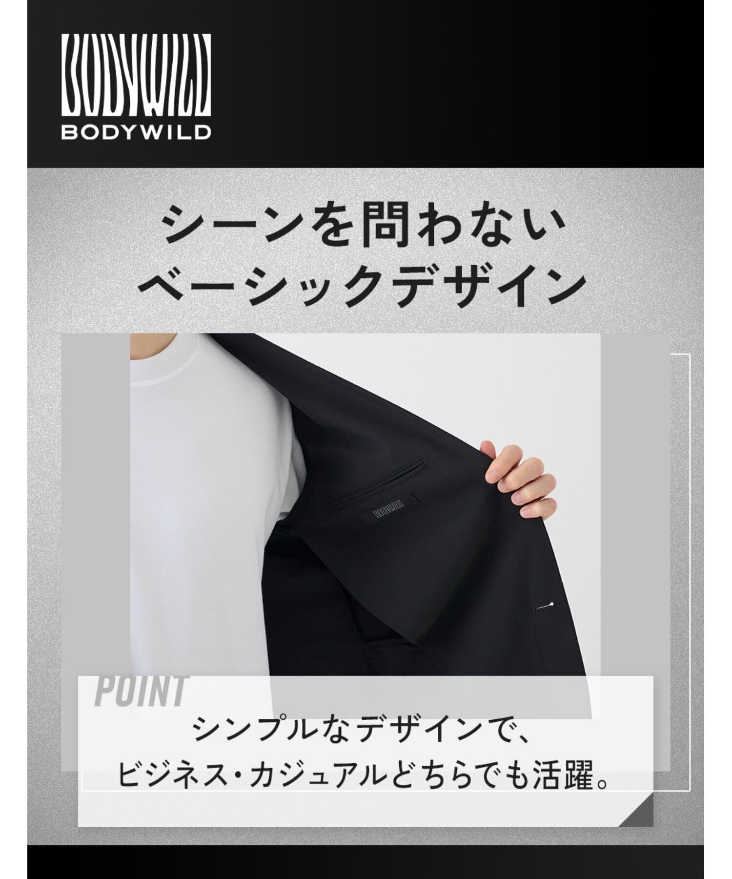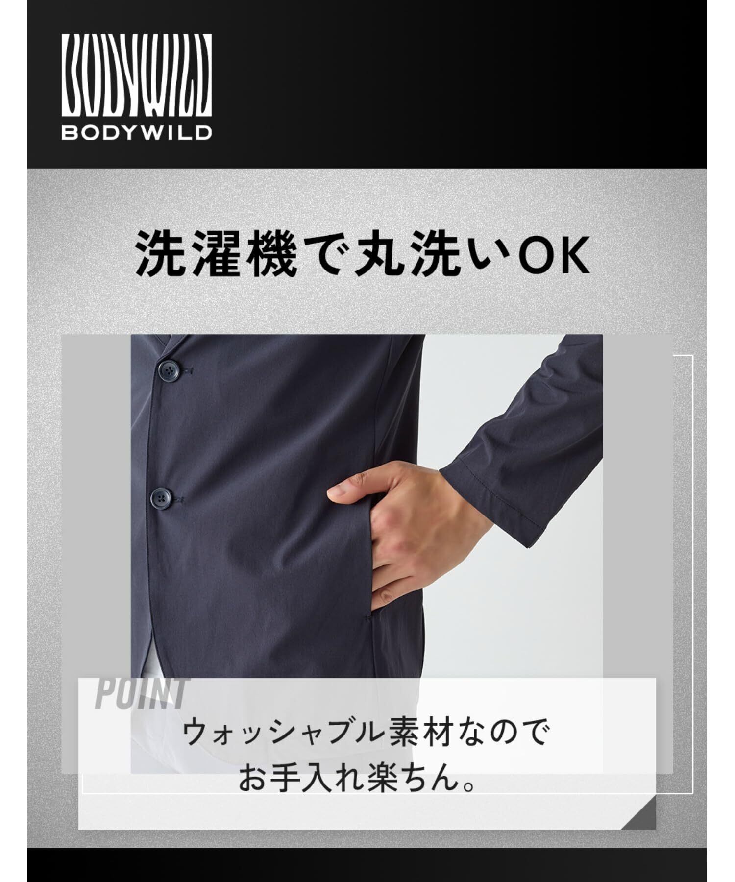 【BODY WILD ジャケット】ナイロン素材のテーラードジャケットは軽量で速乾性があり通気性が高いため快適な着心地。しかも、すべてお家で水洗い可能なので、さっぱり着られてお手入れラクチン。