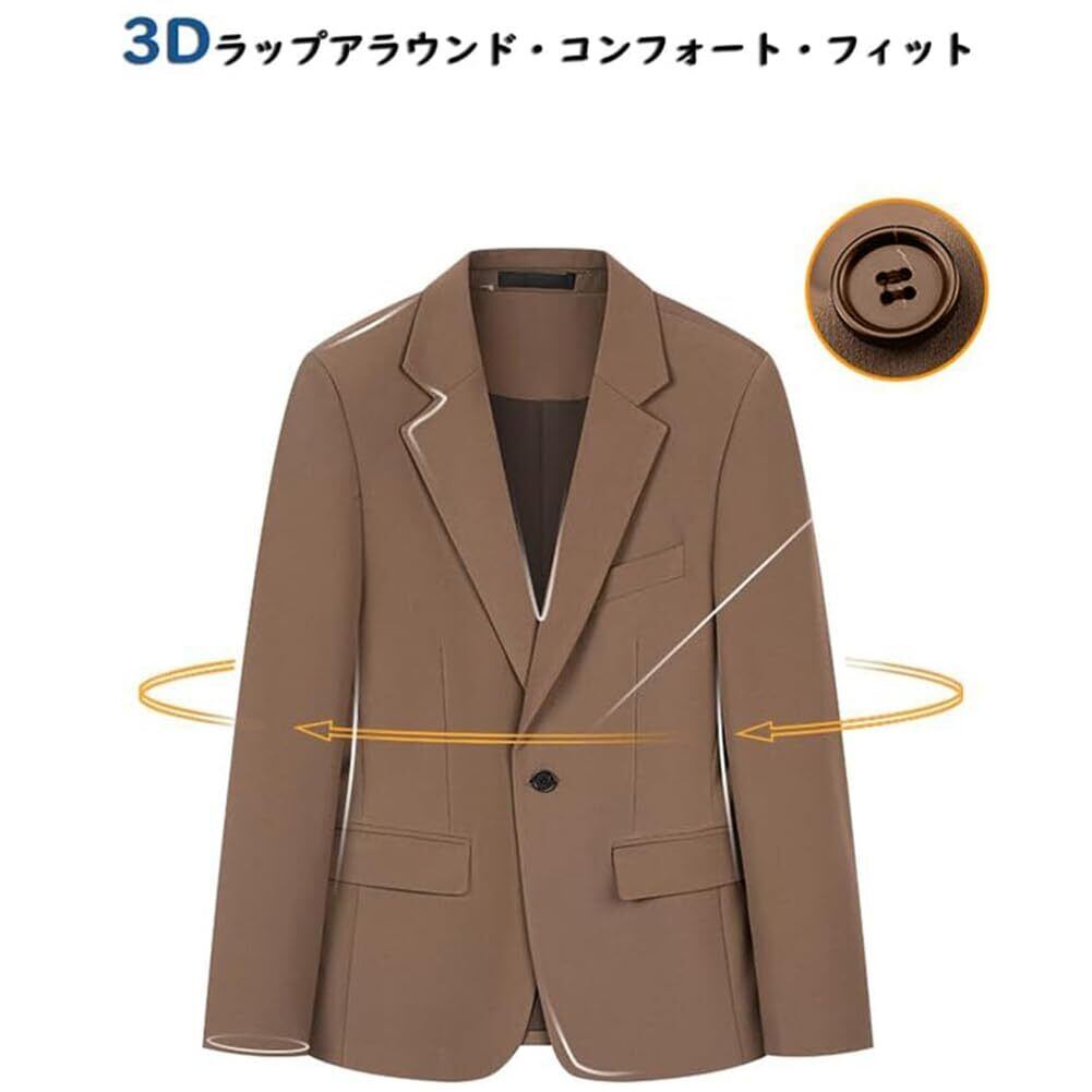 【デザイン】サイドポケット2つが付いております。ベーシックで着回しやすいテーラードジャケット。肩と腕に立体パターンで動きやすく、スマートなシルエットを実現。単品での着用も、セットアップスーツとして同素材のパンツと合わせての着用も可能。普段着にもオフィスカジュアルにもスマートに着まわせる汎用性が魅力。