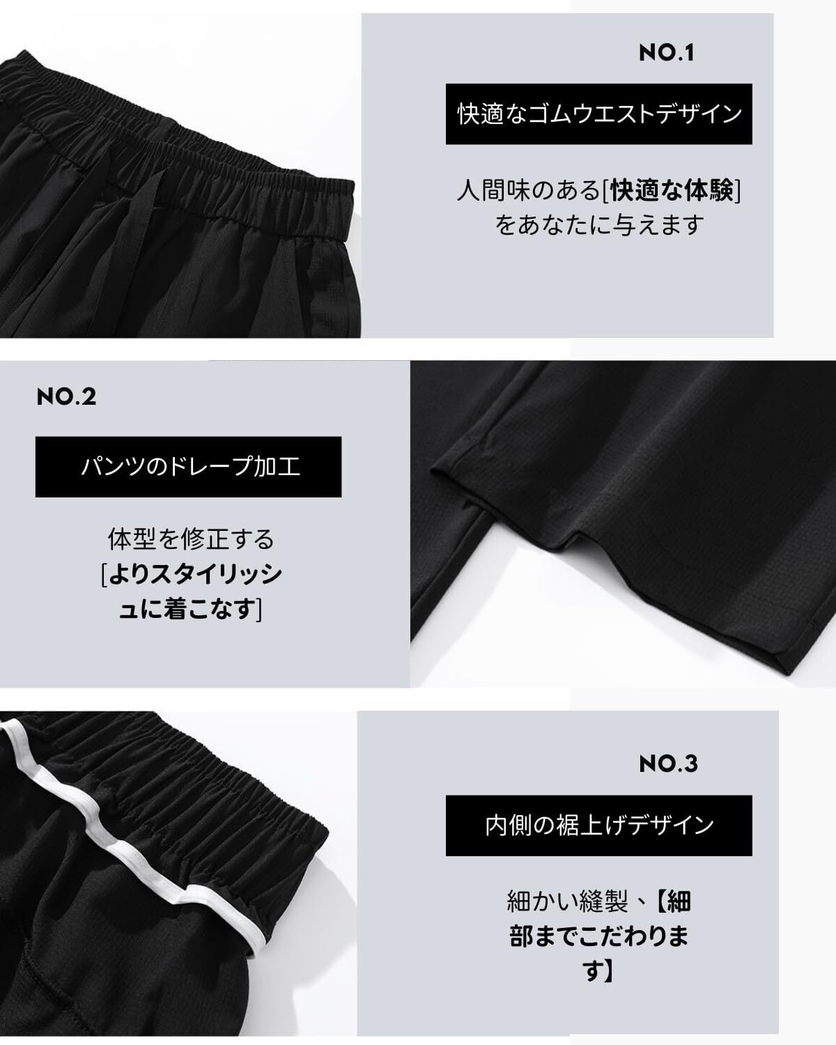 【1】9点冷感パンツ、定番の無地デザイン、3色展開、汎用性が高く、他の服と合わせやすいです。 【2】ゆったりとしたデザインとパンツの両サイドのポケットが全体のファッション感を高めます。 全体的に縦にゆったりとした細身の形です。 【3】とても便利で普段使いはもちろん、キャンプや釣りなどのアウトドアにも最適です。
