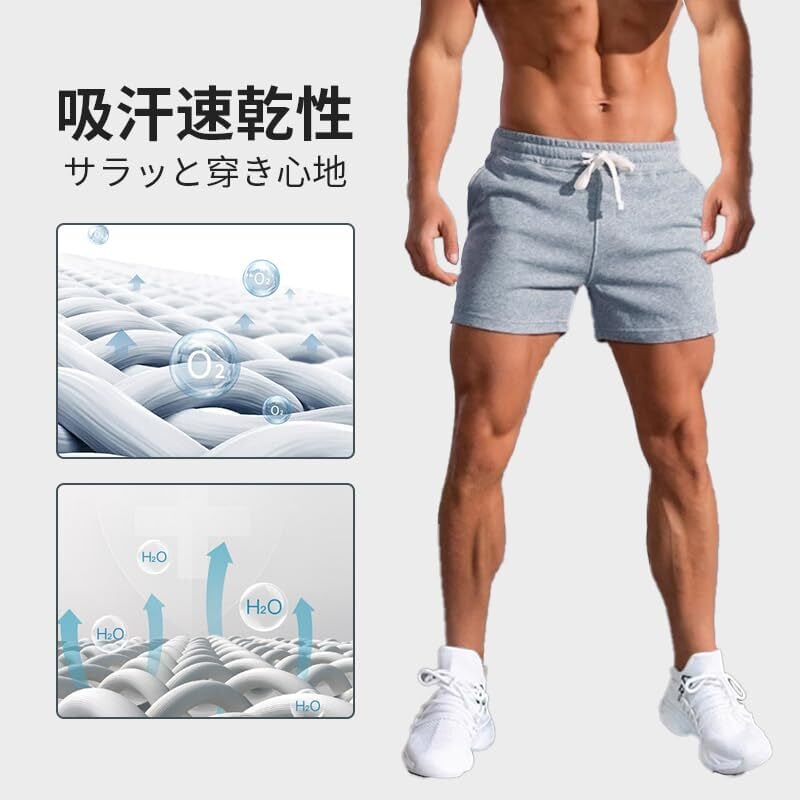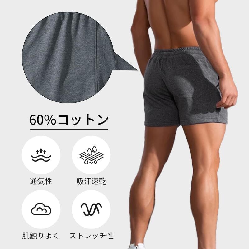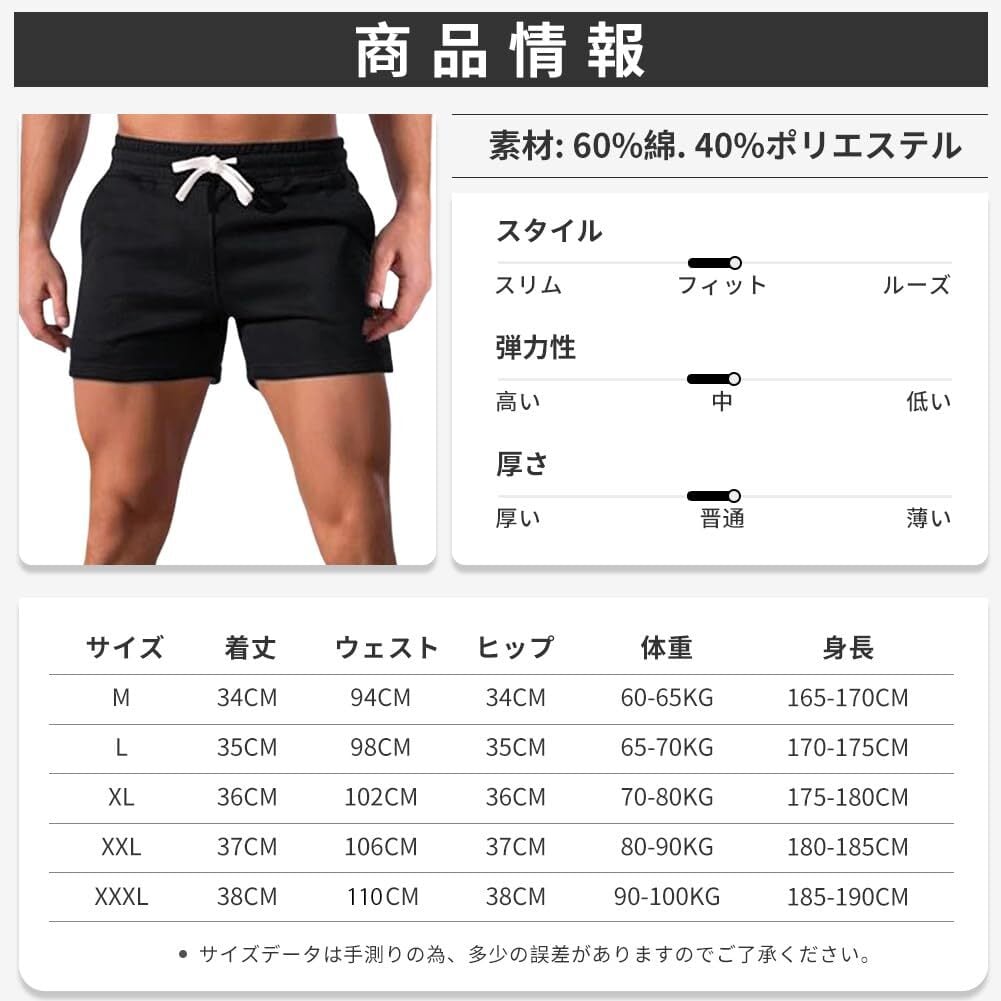 【バリエーション】サイズ:M~3XL; 色:ブラック、ダークグレー、グレー、カーキ; 丈別:三分丈; 素材:60%綿・40%ポリエステル; 適用場合:お出掛け、筋トレ、スポーツウェア、部屋着など日常の普段着としてもオススメします。