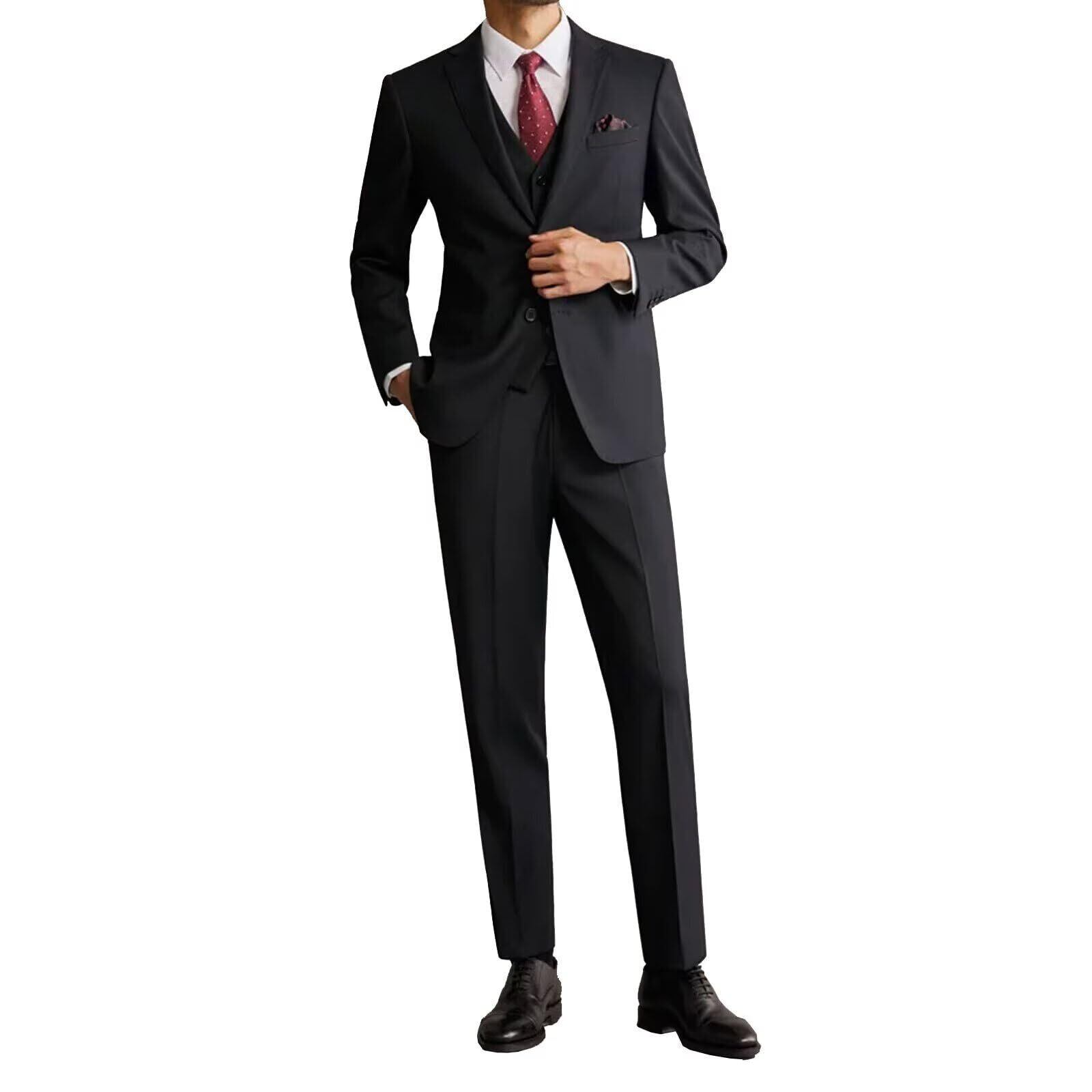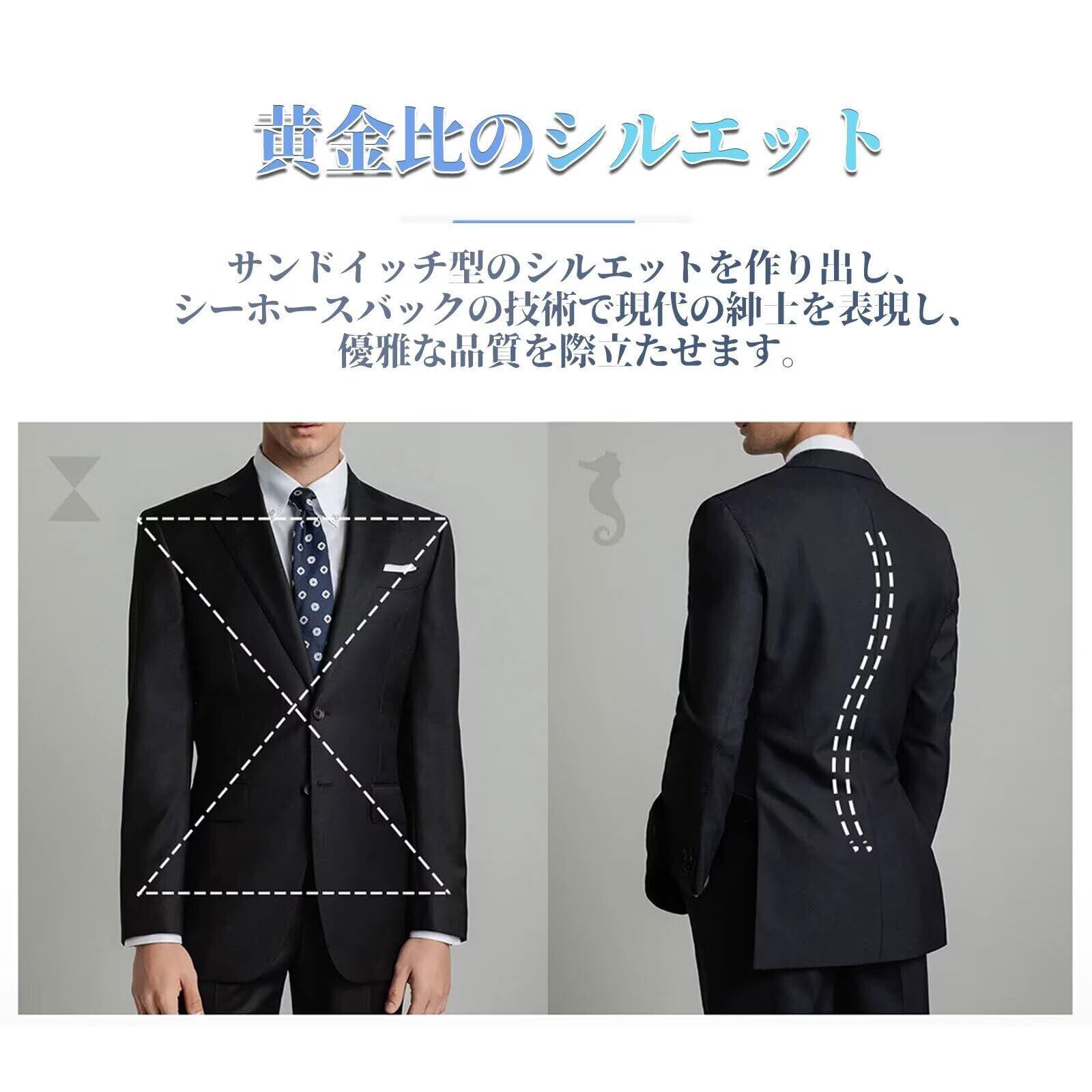 【エレガントなシルエット】このスリムシルエットは、ボディラインを美しく見せ、ウエストを引き締めることで洗練された大人のビジネスマンを演出します。膝下からタイトなスラックスはテーパードデザインで、脚長効果を実現しています。