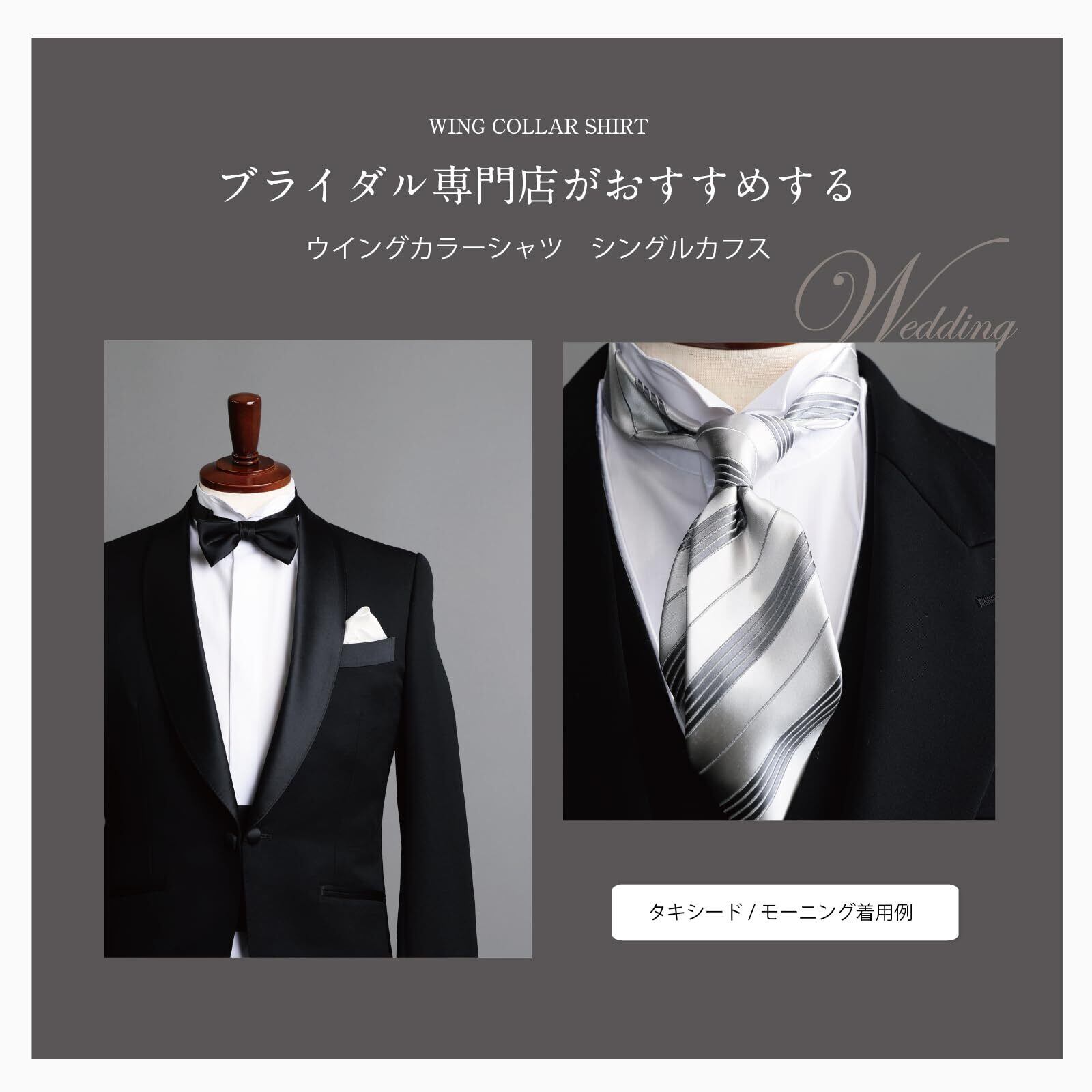 ウイングカラーシャツはネクタイをする衿の折り返し 部分がないため、ネクタイがズレて崩れてしまうことが あります。このため、ウイングカラーシャツの背面にはネクタイを 通すための紐が輪の状態でついています。 結婚式や披露宴で、主に、新郎や主賓が着用していることが多く、 参列する親族の方が着用している場合もあります。 最近では、同僚や友人の結婚式の二次会で着用する方も 増えています。