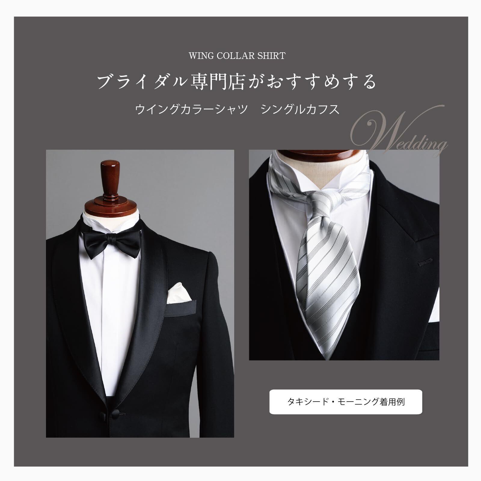 ウイングカラーシャツはネクタイをする衿の折り返し部分が ないため、ネクタイがズレて崩れてしまうことがあります。 このため、ウイングカラーシャツの背面にはネクタイを 通すための紐が輪の状態でついています。 結婚式や披露宴で、主に、新郎や主賓が着用していることが多く、 参列する親族の方が着用している場合もあります。 最近では、同僚や友人の結婚式の二次会で着用する方も増えています。 蝶ネクタイとの相性も抜群です。