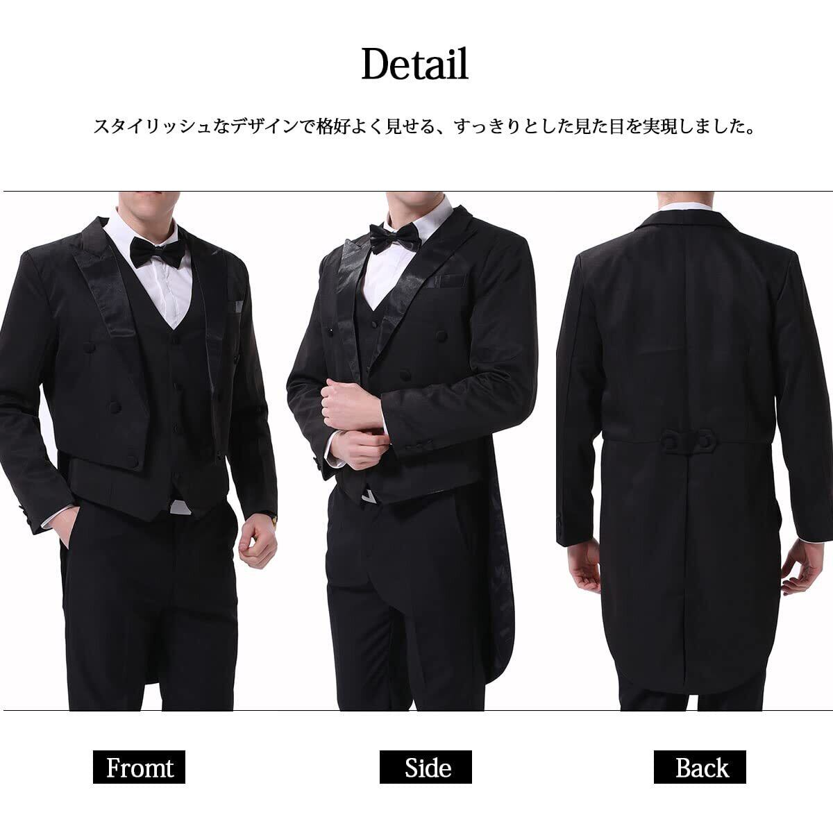 構成:ジャケット:前あわせはウエスト部分でほぼ水平にカットされ、後部は腰を覆い燕の尾状にテールが伸びる。前ボタンはかけずに着用する。ベストとズボン。ネクタイも付け。