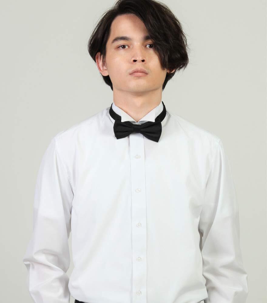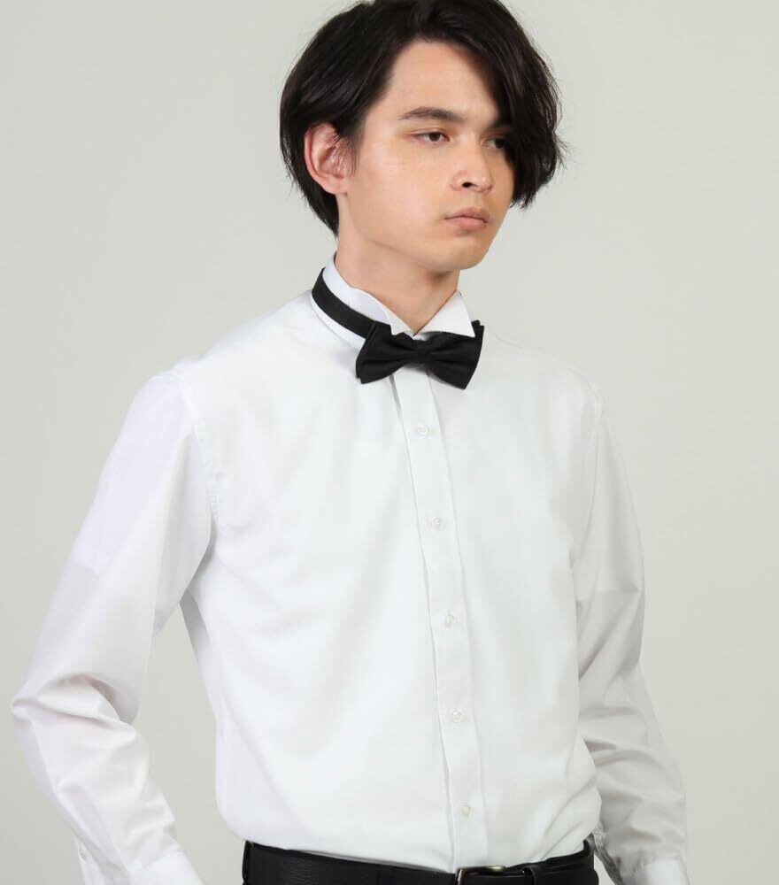 タキシードシャツやモーニングシャツを着用したフォーマルな場で必須のウイングカラーシャツです。結婚式・披露宴・ブライダル・二次会等においても頻繁に使われるシャツです。