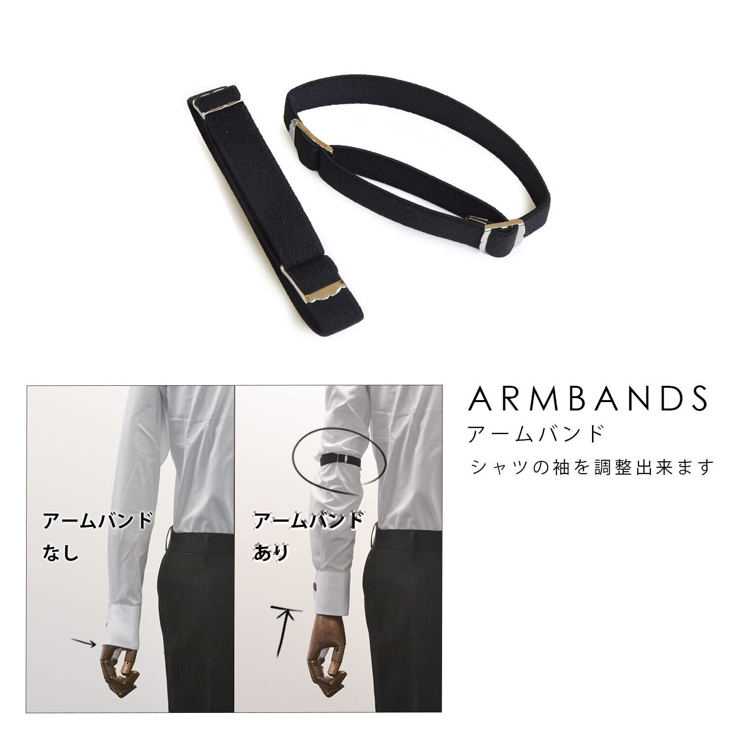 サスペンダーはクオリティの高い日本製のメンズ企画のLサイズをセット。短くアジャストが行え、身長160cmくらいのお客様から問題なくご利用可能です。アームバンドのご使用で、スーツの袖口から出るシャツの長さを微調整が行えます。左右で微妙に違う場合にも対応が行えます。