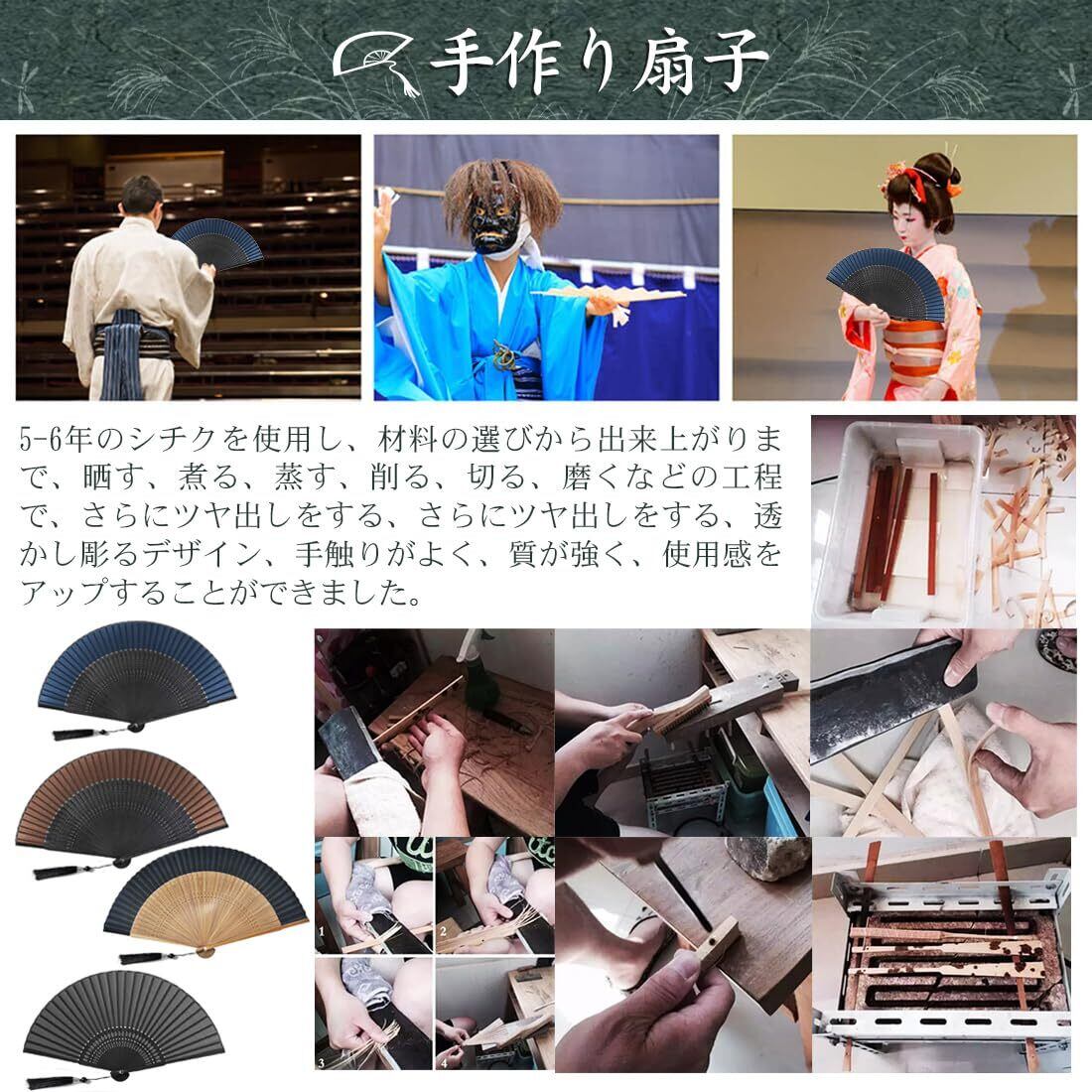 【上品なデザイン】:大活躍なおしゃれなデザイン。扇面はシルク製で透け感が綺麗で触り心地がいいです。控え目な落ち着いた色合いで組合し、性別や年齢問わず、ご愛用いただけるシンプルで洗練された デザインが自慢の扇子です。その上、竹骨の部分を透かし彫りにして精巧でデザインがエレガントです。浴衣に合わせるのはもちろん、普段使いにもいいチョイスです。ご注意ください:扇子は長期間折りたたまれた状態で保管されているため、最初のご使用時には開きにくい場合がございます。また、扇面の素材の特性上、使用を重ねることで布地が柔らかくなってまいります。そのため、何度かご使用いただいた後には、扇子を片手でスムーズに閉じられないことがあり、その際は一部の骨を指で調整していただく必要がある場合がございます。こちらは商品の仕様によるものであり、ご使用には支障ございませんので、あらかじめご了承ください。