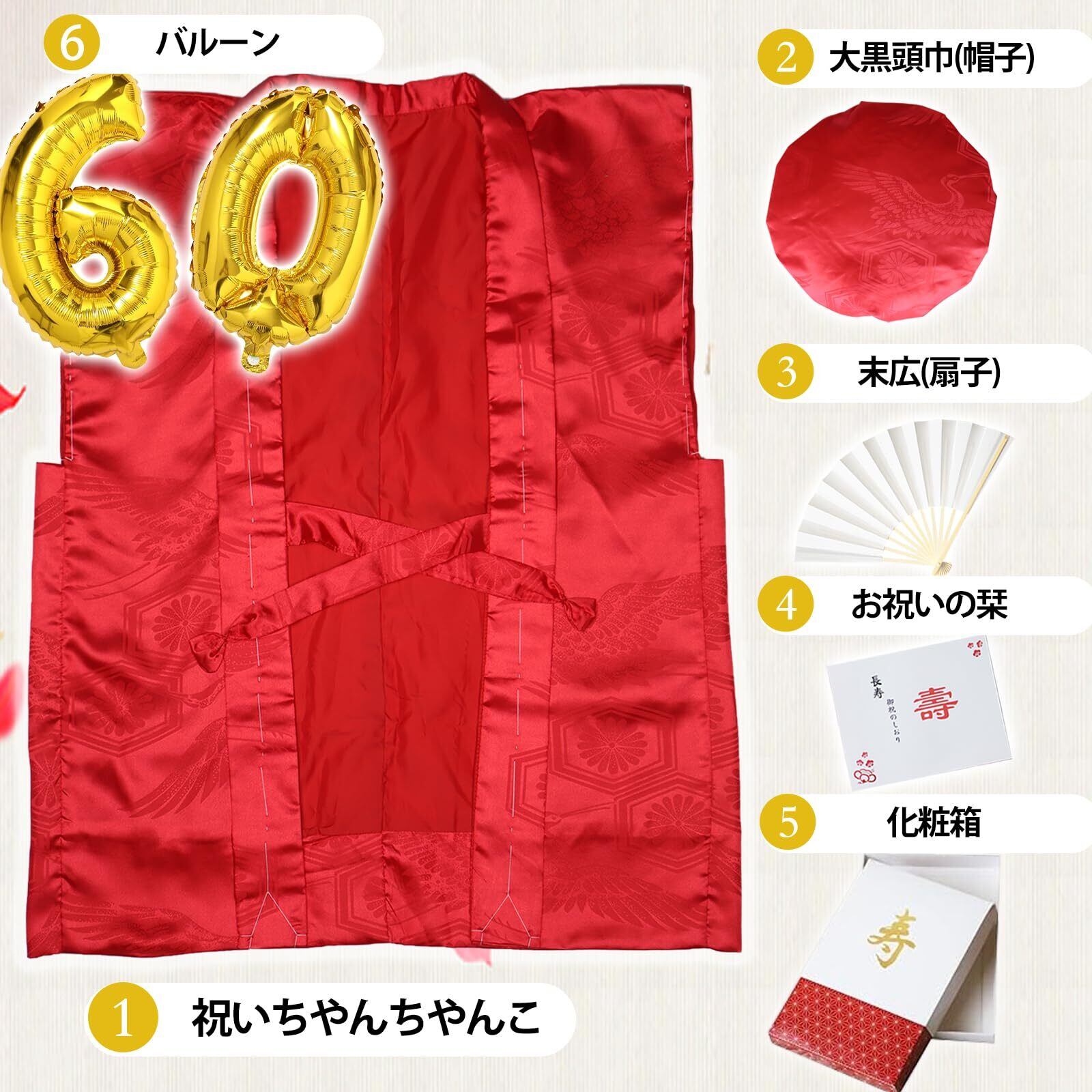 セット内容:大黒頭巾、赤いちゃんちゃんこ、末広(扇子)、栞、バルーン、化粧箱の計6点。(弊店のストアーでは、バルーン付/バルーン無しの2種類の商品があります、必ずご確認の上、ご購入をお願い致します。)
