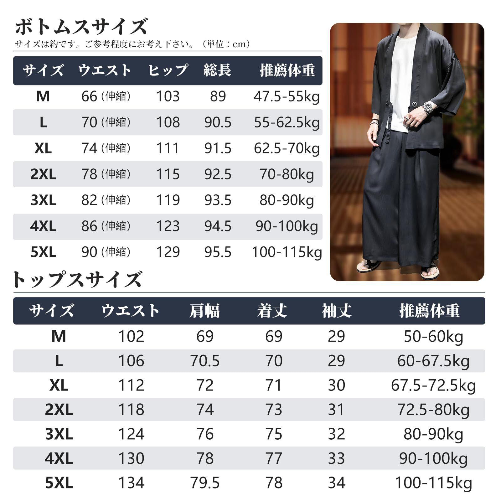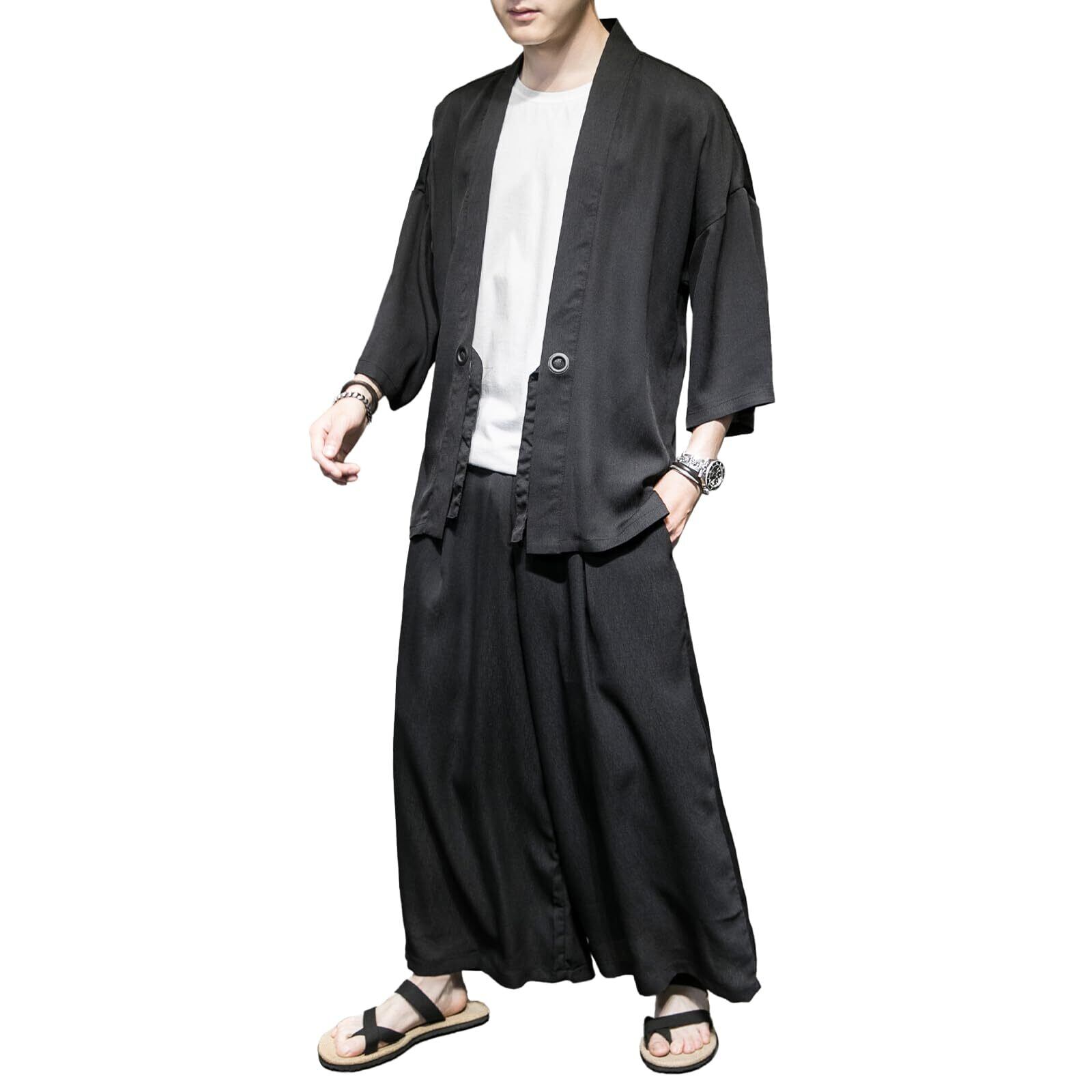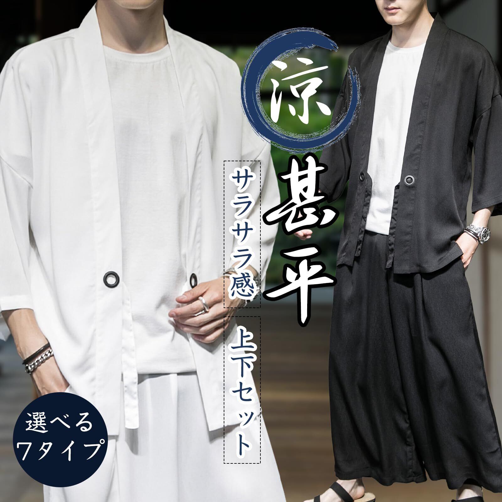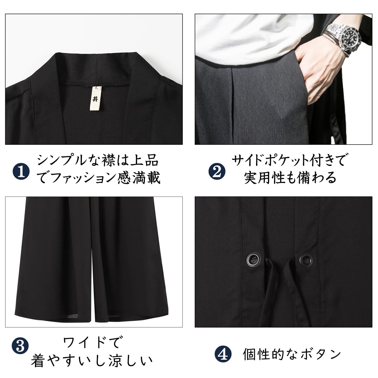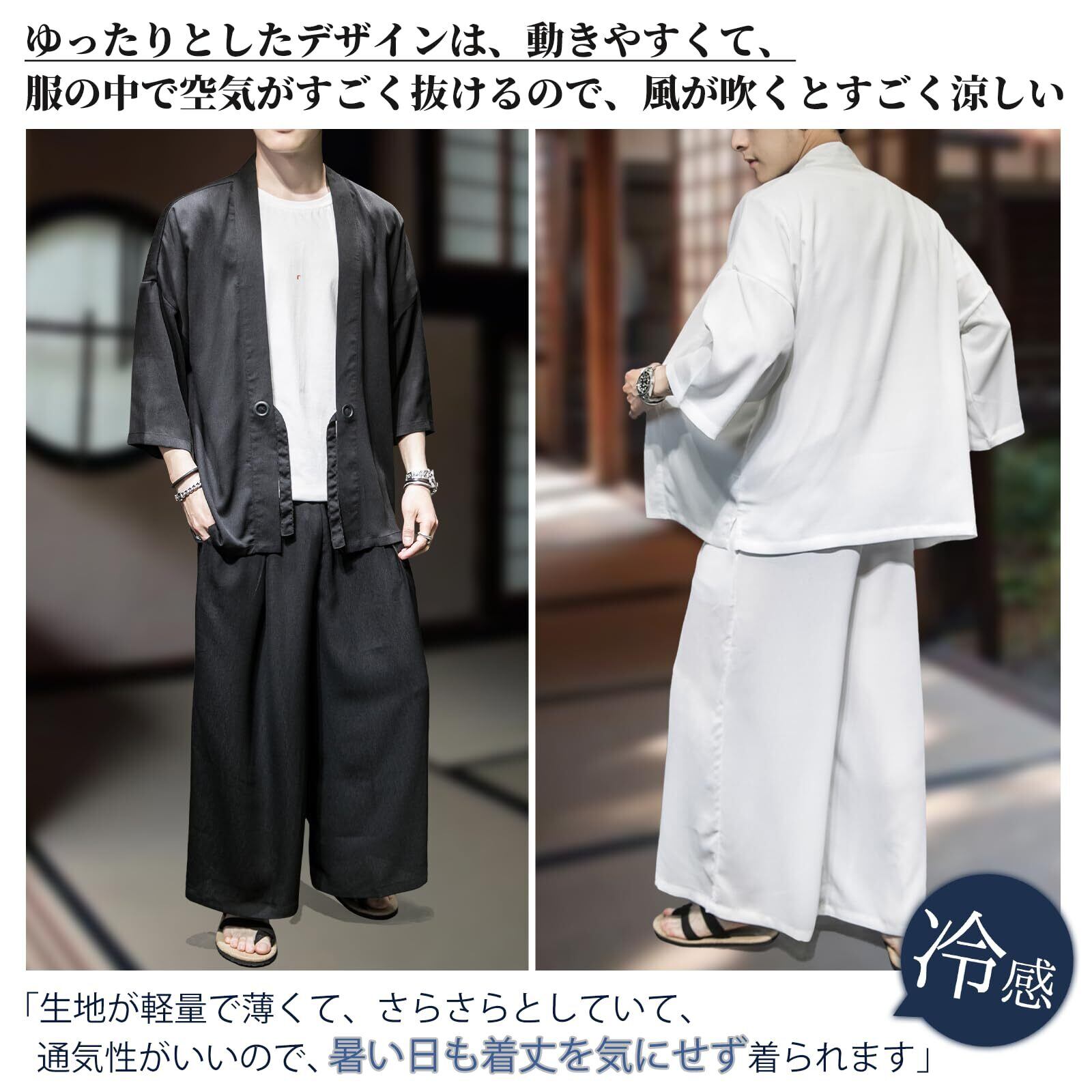[inotenka] 甚平 メンズ 作務衣 羽織 セットアップ メンズ 上下セット 和風 カジュアル ロング カーディガン 7分袖 ゆったり 薄手 おしゃれ ルームウェア 春夏秋冬 花火大会/祭り/散歩/部屋着 日焼け対策 冷房対策 黒 白 大きいサイズ