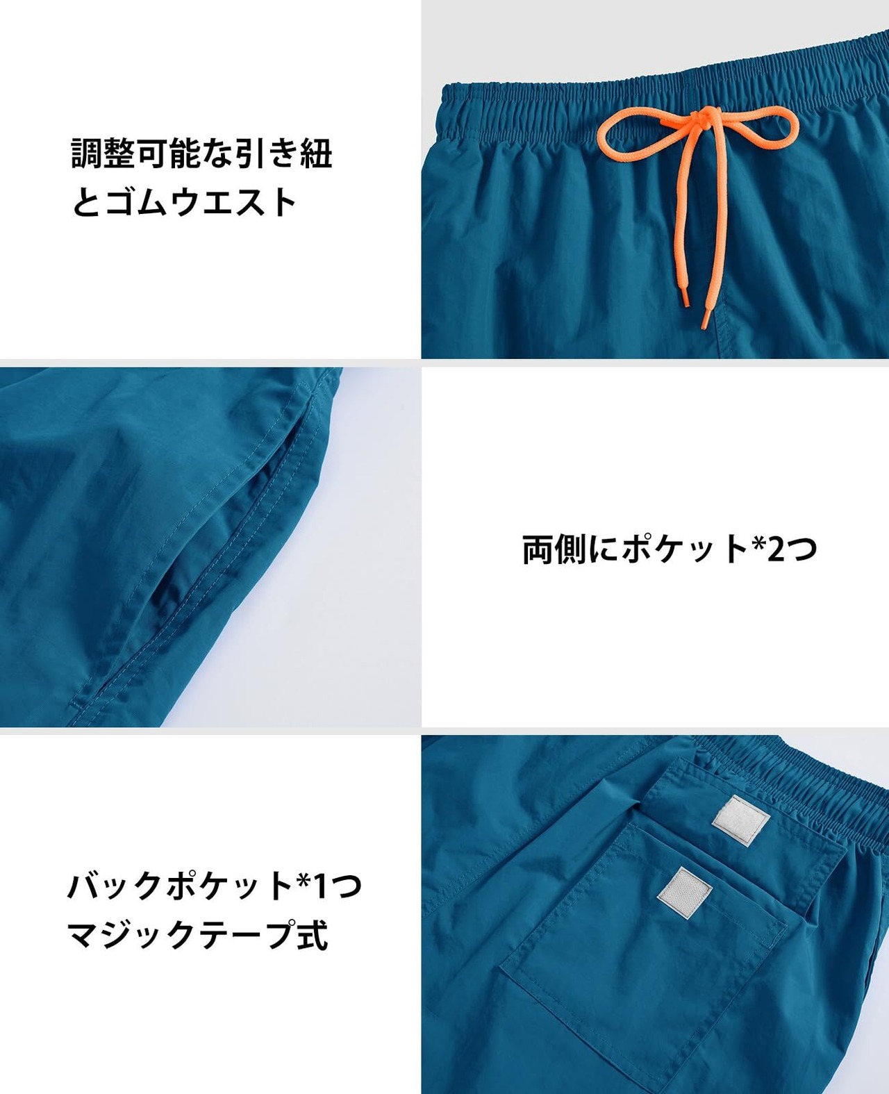 デザイン:ウエストは調整可能な引き紐付き、腰まわりが楽ちんなイージー。両側にポケットと後ろ(右)にマジックテープ付きなポケットで、小物収納、紛失防止などの心配もなくなる。