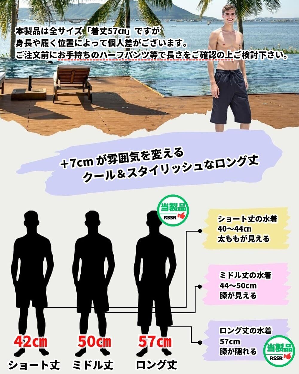 【+7㎝&ゆったり長めが好きな方におススメ】トランクス型水着でもピタっとしたタイプや丈が短すぎるのが苦手な方におススメのサーフパンツ。一般的な水着(45~50㎝丈)の+7㎝の57cm丈で、身長や履く位置にもよりますが膝が隠れるぐらいの長さで落ち着きを演出。ロゴやワッペン等のないシンプルな無地デザインなので幅広い年代の方にご着用頂け、プールに行く時にこのまま着て行っても違和感なし