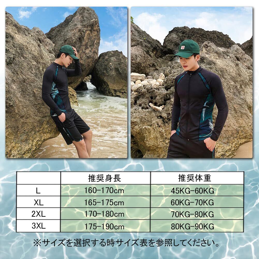 【着用サイズ&セット内容】【着用サイズ】【L: 推奨身長160-170cm/推奨体重:45KG-60KG】【XL:推奨身長165-175cm/推奨体重:60KG-70KG】【2XL:推奨身長170-180cm/推奨体重:70KG-80KG】【3XL:推奨身長175-190cm/推奨体重:80KG-90KG】※サイズを選択する時サイズ表を参照してください。【セット内容】長袖ラッシュガード、ハーフパンツ、レギンスの3点セット。必要なものがセットになっているので、届いてすぐに海に行くことができます。サーフパンツとレギンスセット、レギンス付き足首まであるので、虫刺されやクラゲ対策、擦り傷などの外傷対策にも。