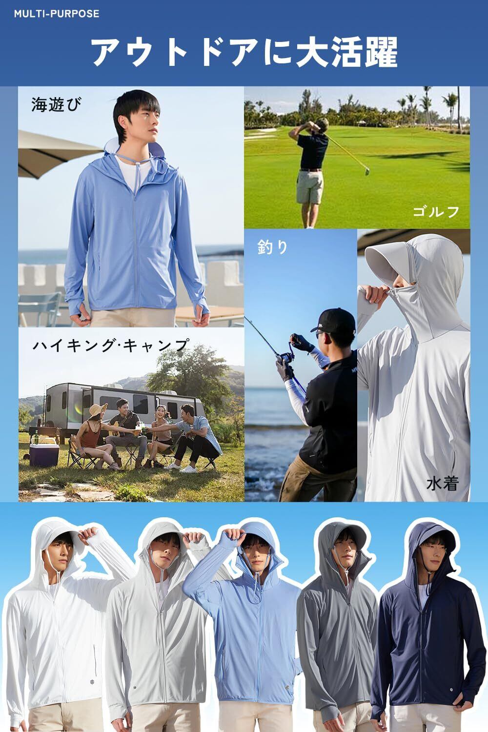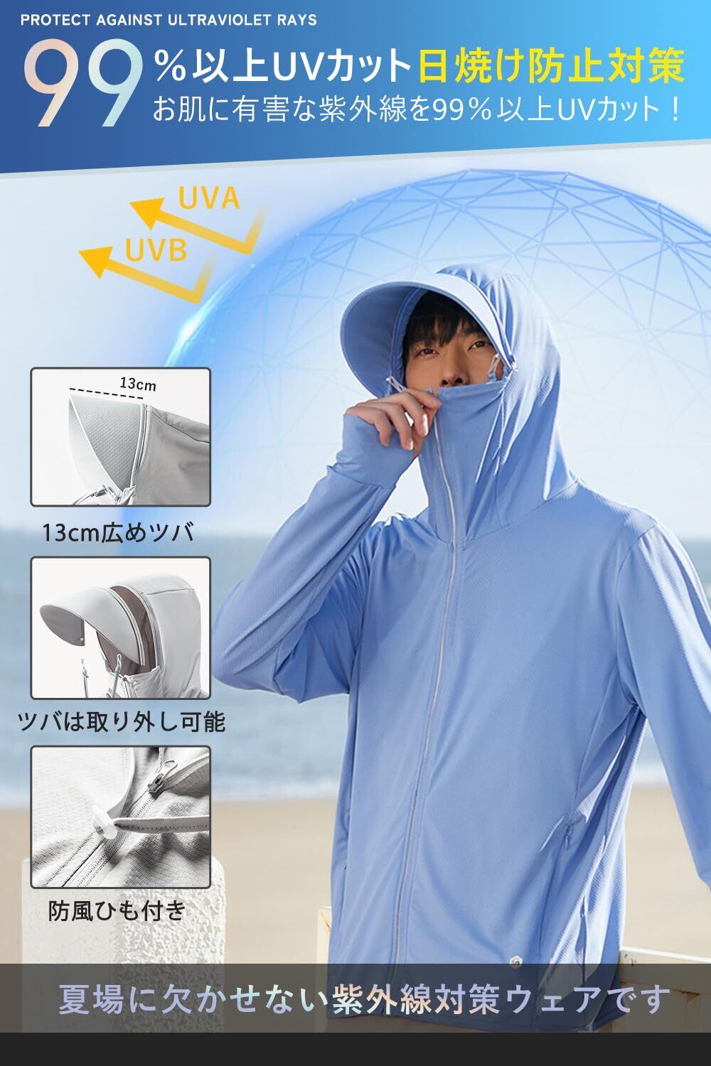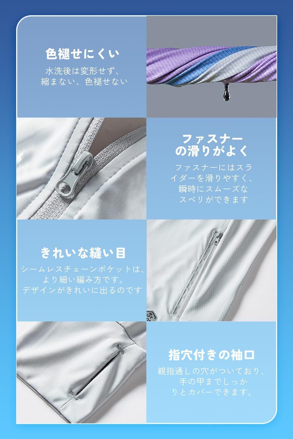 【デザインにこだわり&使い勝手がいい】①日焼け止めパーカーはファスナーで顔まで伸ばして、ケアしづらい首と顔もカバーできます。②取り外し可能な帽子ツバ、より広いつばと高いネックラインにより、日焼け防止エリアを広げ、直射日光から多角的に保護し日焼けを防ぐ。③指穴付きになったデザインで、手の甲をしっかり覆うことができます。このuvカットパーカーは、暑い夏に紫外線による日焼けからお肌を守るのにとても重要です。