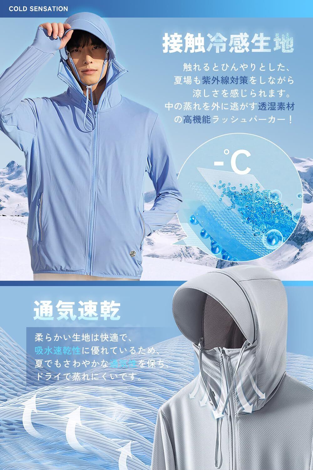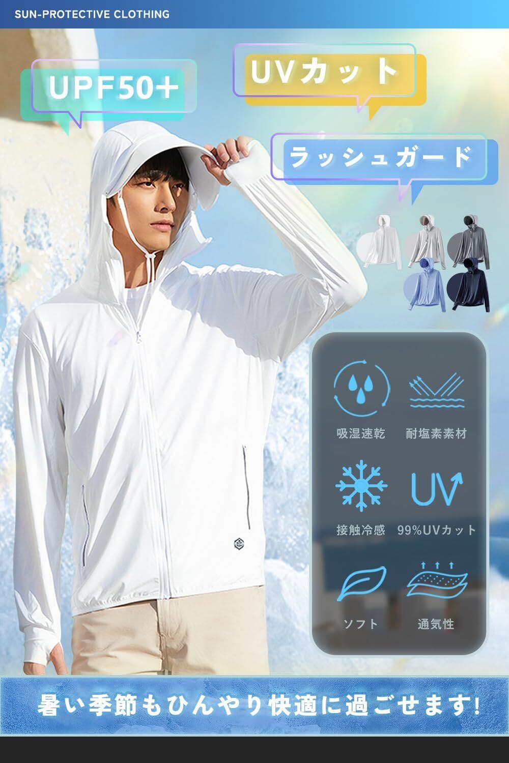 [Moxiep] ラッシュガード メンズ uvカット パーカー 夏 日焼け止め (UPF50+UVカット99%・接触冷感・吸汗速乾・通気性)水着 アウター フード付き 薄手 トップス 長袖 涼しい 紫外線対策 海 アウトドア 無地 おしゃれ