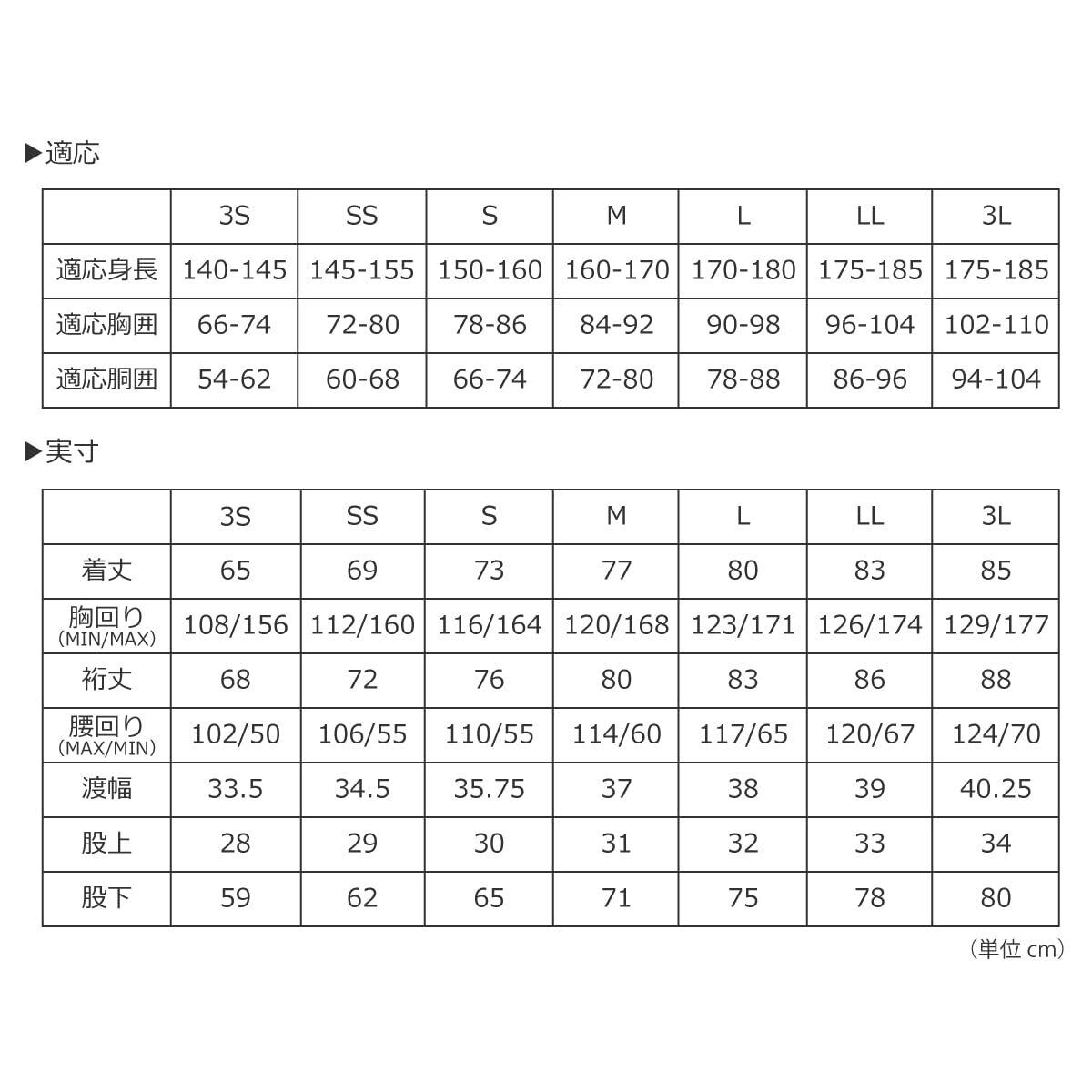 SIZE:3S ジャケット(着丈:65㎝ 胸回り:108~156㎝ 裄丈:68㎝)パンツ(ウエスト:50~102㎝ 股下:59㎝)、SIZE:SS ジャケット(着丈:69㎝ 胸回り:112~160㎝ 裄丈:72㎝)パンツ(ウエスト:55~106㎝ 股下:62㎝)、SIZE:S ジャケット(着丈:73㎝ 胸回り:116~164㎝ 裄丈:76㎝)パンツ(ウエスト:55~110㎝ 股下:65㎝)、SIZE:M ジャケット(着丈:77㎝ 胸回り:120~168㎝ 裄丈:80㎝)パンツ(ウエスト:60~114㎝ 股下:71㎝)、SIZE:L ジャケット(着丈:80㎝ 胸回り:123~171㎝ 裄丈:83㎝)パンツ(ウエスト:65~117㎝ 股下:75㎝)、SIZE:LL ジャケット(着丈:83㎝ 胸回り:126~174㎝ 裄丈:86㎝)パンツ(ウエスト:67~120㎝ 股下:78㎝)、SIZE:3L ジャケット(着丈:85㎝ 胸回り:129~177㎝ 裄丈:88㎝)パンツ(ウエスト:70~124㎝ 股下:80㎝)