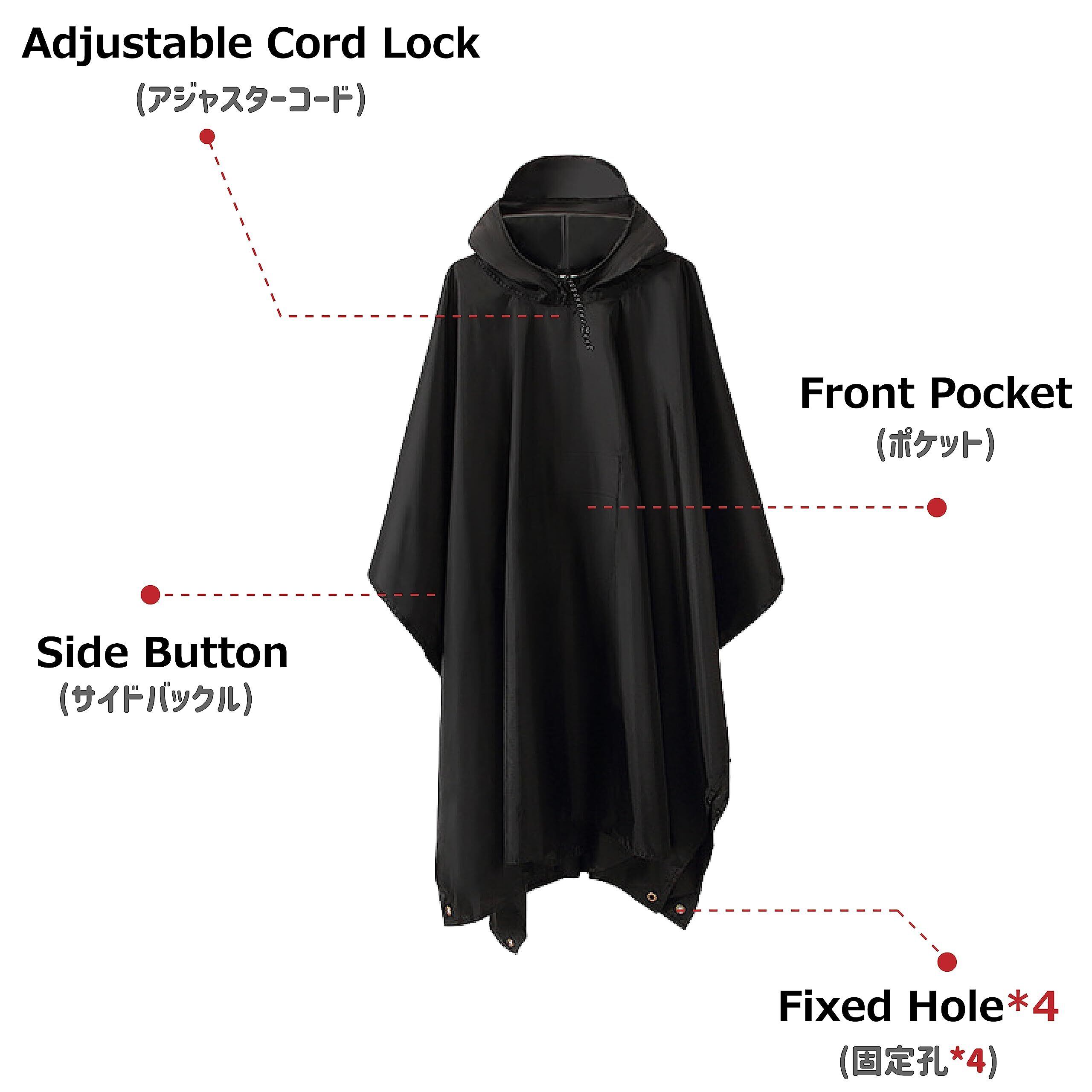 【フリーサイズポンチョ】長さ:106cm、幅:142cm、収納サイズ:14 × 17 (cm)、重量:300g、男女兼用。自転車対応、リュック・バックパックを背負った時も着用できま