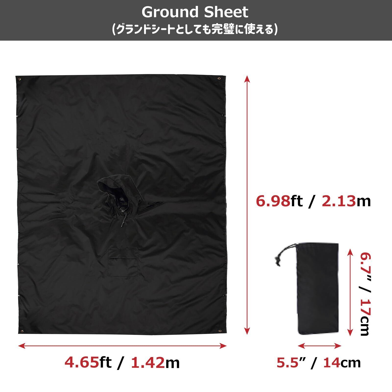 【多機能レインウェア】ポンチョの前後を展開してグランドシート/タープになります(長さ:142cm、幅:213cm)。四隅に固定孔があり、テントの下に敷いたり、タープとして張ったりするのは完璧です