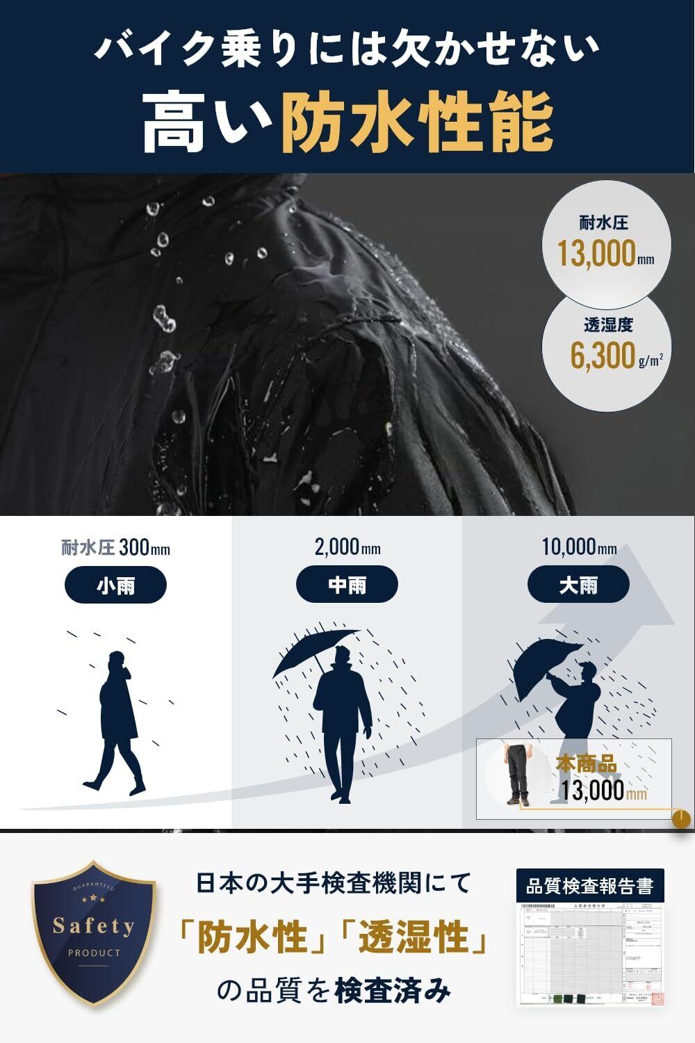 【大雨にも耐えられる高い防水性】耐水圧13,000mmと高い防水性能となっており、雨の中でのバイクや自転車を運転することを想定した高い機能を備えています。