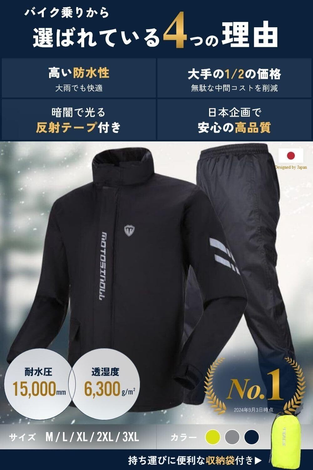 【利用シーン】バイク、サイクリング、子供の送迎、登山、釣り、アウトドア、キャンプ、スポーツ、防災など 【機能】■防水(耐水圧13,000mm)、防風、防寒 【カラー】ブラック、グレー、イエロー 【重量】ジャケット約350g、パンツ約300g 【メイン素材】ポリエステル 【サイズ】M~3XL <ジャケット> 着丈 /肩幅/胸囲 /袖丈 [M] : 69 / 47 / 112 / 60.2 [L] : 71.5 / 48.5/ 116 / 62 [XL] :74 / 50 / 120 / 63.8 [2XL] :76.5 / 51.5 / 124 / 65.6 [3XL] :795 / 53 / 128 / 67.4 <パンツ> ウエスト /着丈 [M] : 80 / 99 [L] : 84 / 102 [XL] :88 / 105 [2XL] :92 / 107 [3XL] :96 / 109